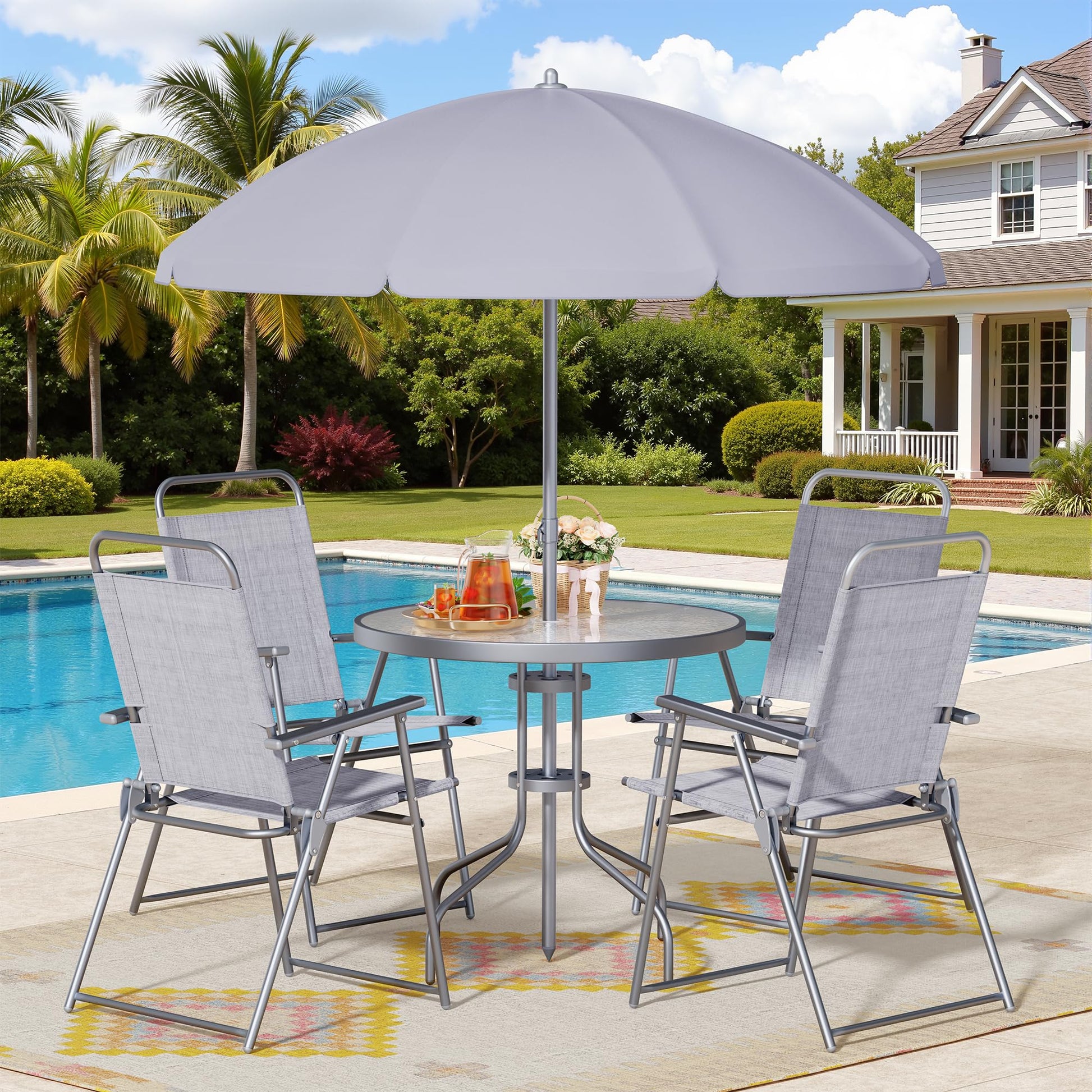 Shintenchi 6 Piece Patio Dining Set with Umbrella, Outdoor Furniture Set with 4 Folding Chairs and Tempered Glass Top Dining Table fot Lawn Backyard Garden Porch, Silver