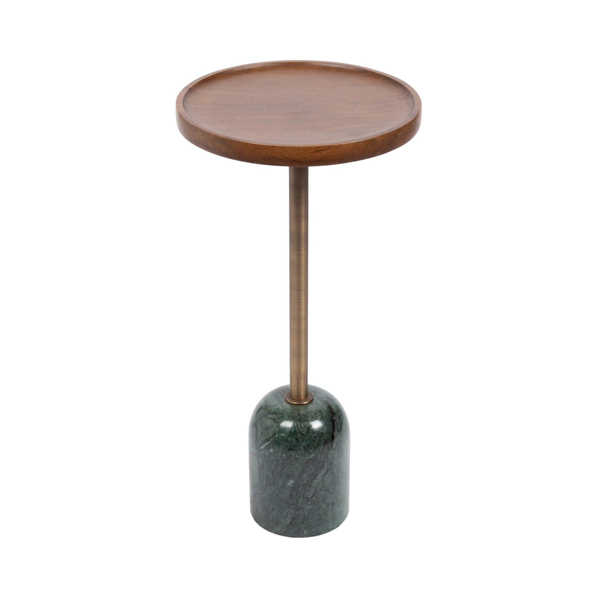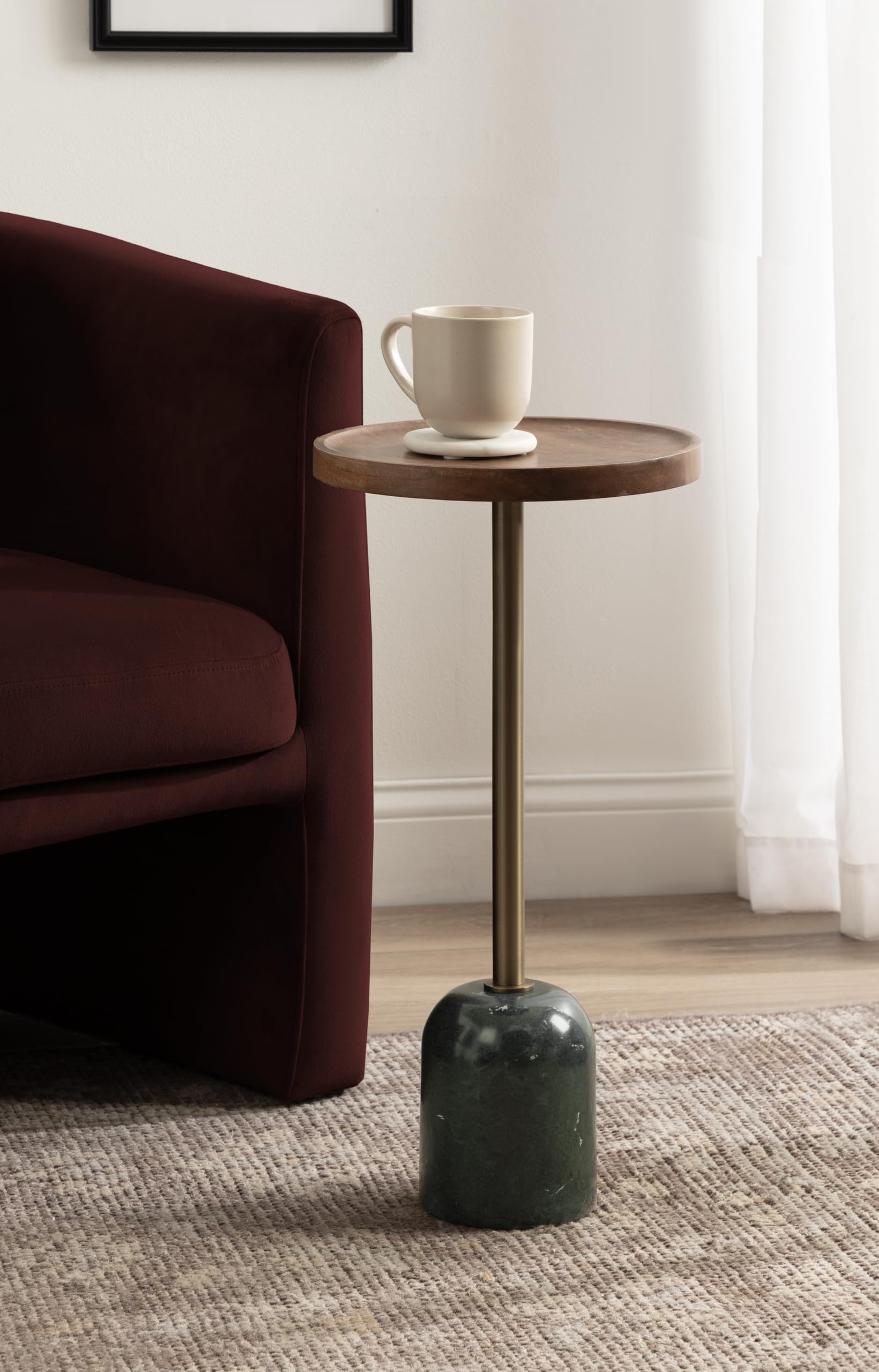 Design a minimal and modern space with the Shorrock side table. Inspired by contemporary design, this pedestal-style table features a round tabletop and a distinctive shaped base. The tabletop is crafted from solid mango wood with a rich marble stone base, while the frame is made from resilient iron. Each table is handcrafted in India, giving every piece its unique woodgrain and marble veining.