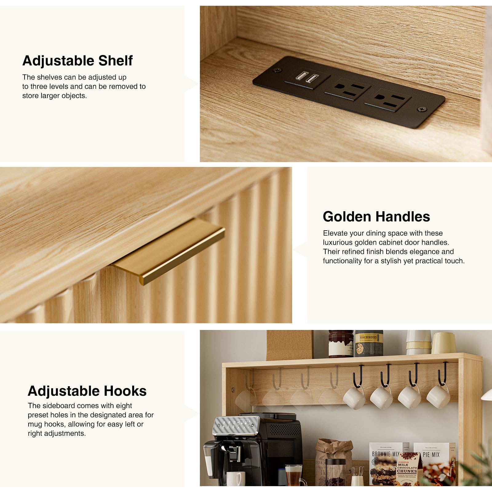 Perfect for dining rooms, kitchens, and living rooms. Use as a coffee bar station, tea service area, buffet cabinet, or general storage solution. The built-in outlets make it especially convenient for housing coffee makers, electric kettles, and other small appliances.