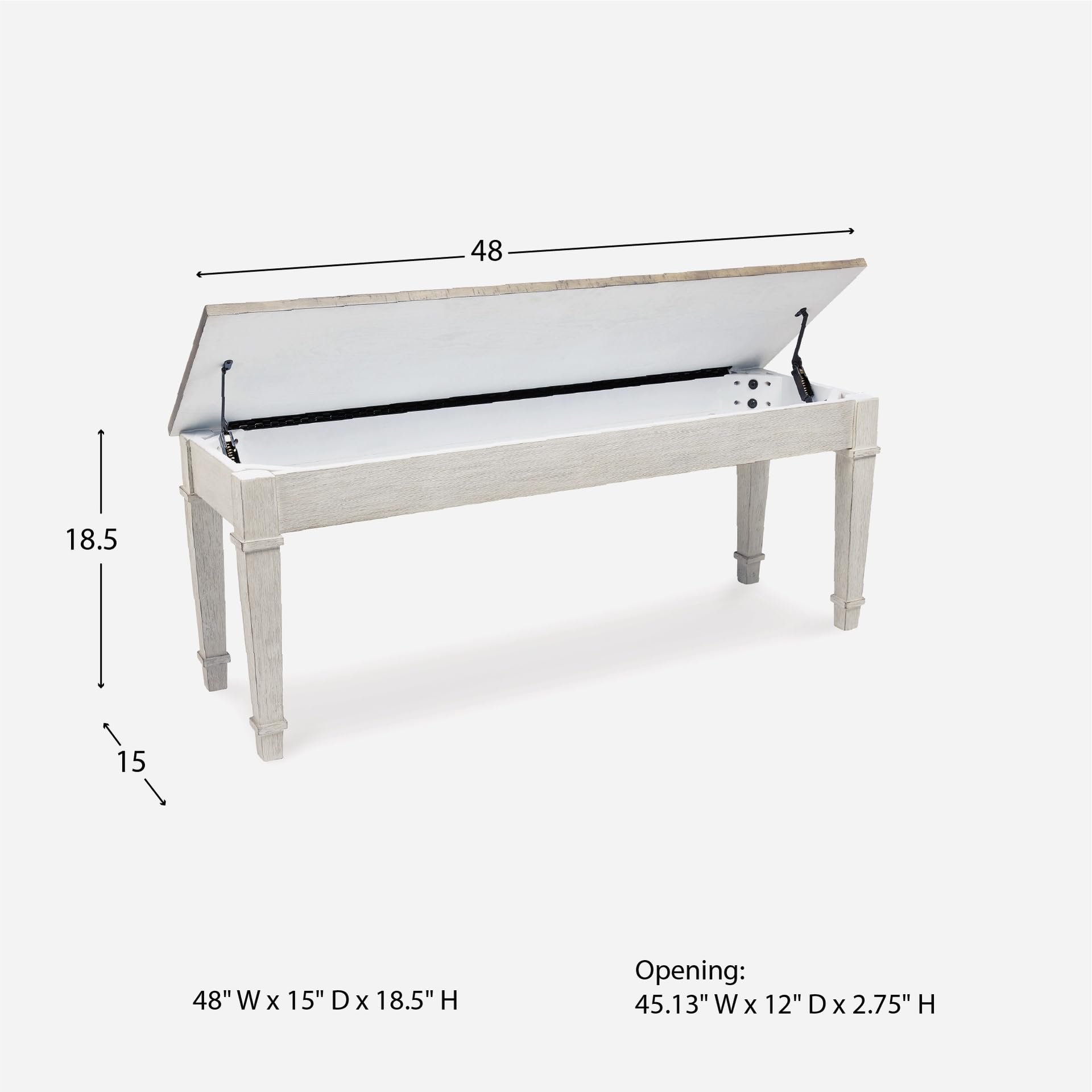 Transform your entryway or bedroom with this charming farmhouse storage bench. Featuring a distressed white and light brown finish, this piece combines rustic elegance with practical functionality. The hinged seat lifts to reveal generous hidden storage space, perfect for organizing blankets, pillows, shoes, or seasonal items.