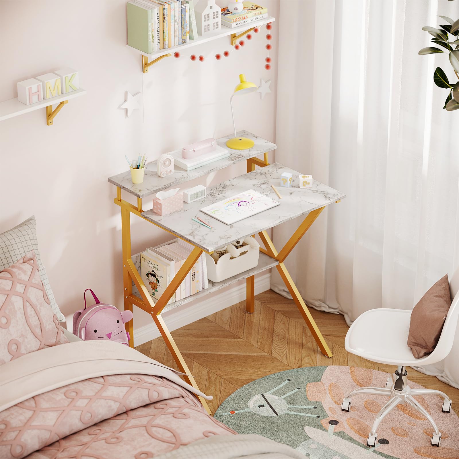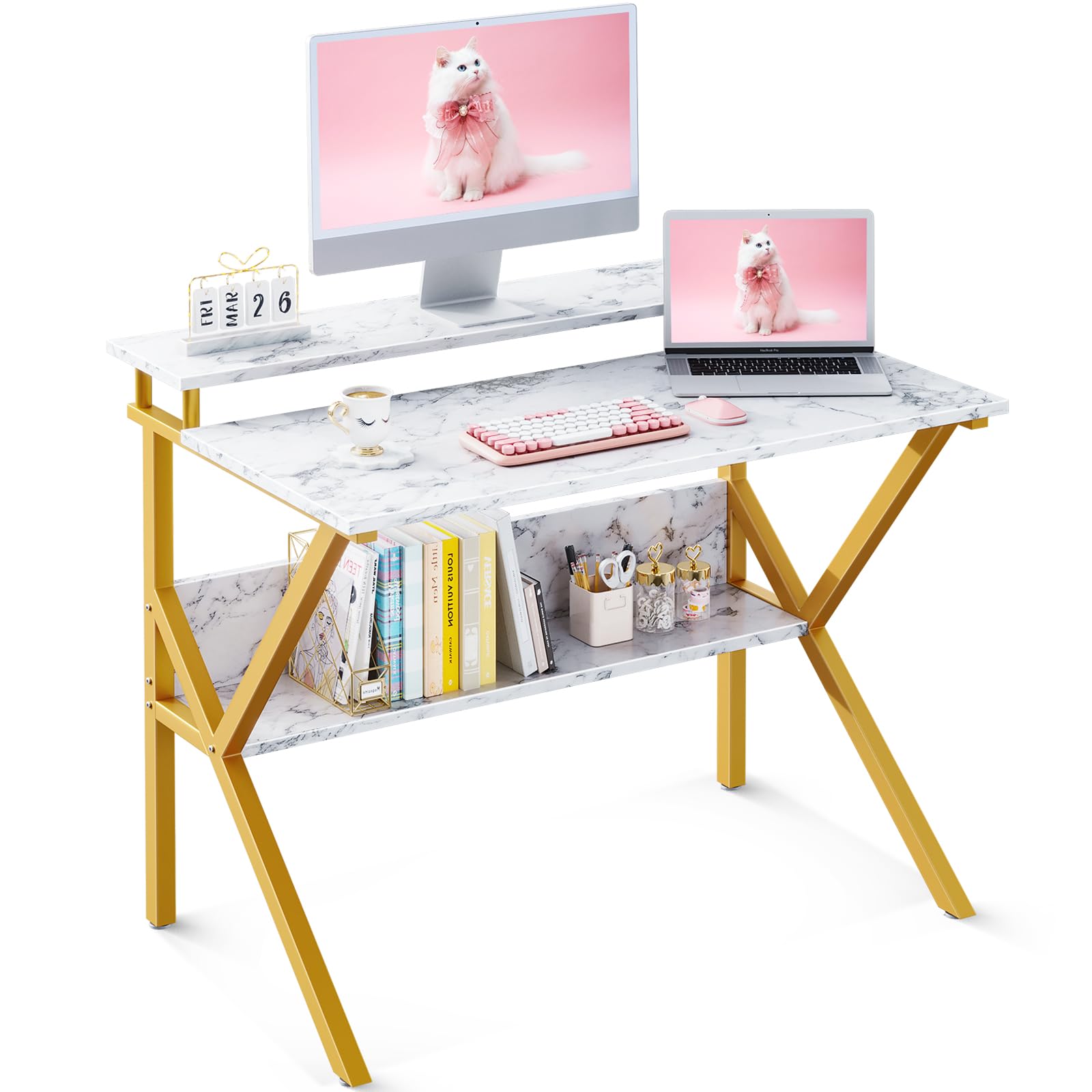 - Three-tier storage: top shelf for monitors/lamps, middle desktop for laptops/books, bottom shelf for supplies