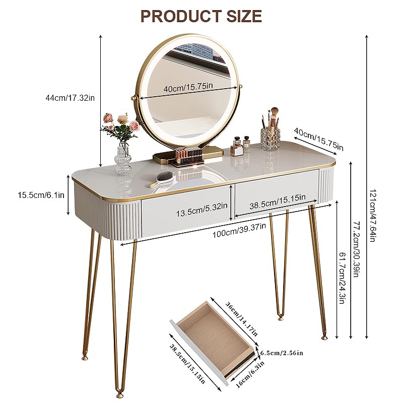 - Two spacious drawers for organized storage of cosmetics and accessories