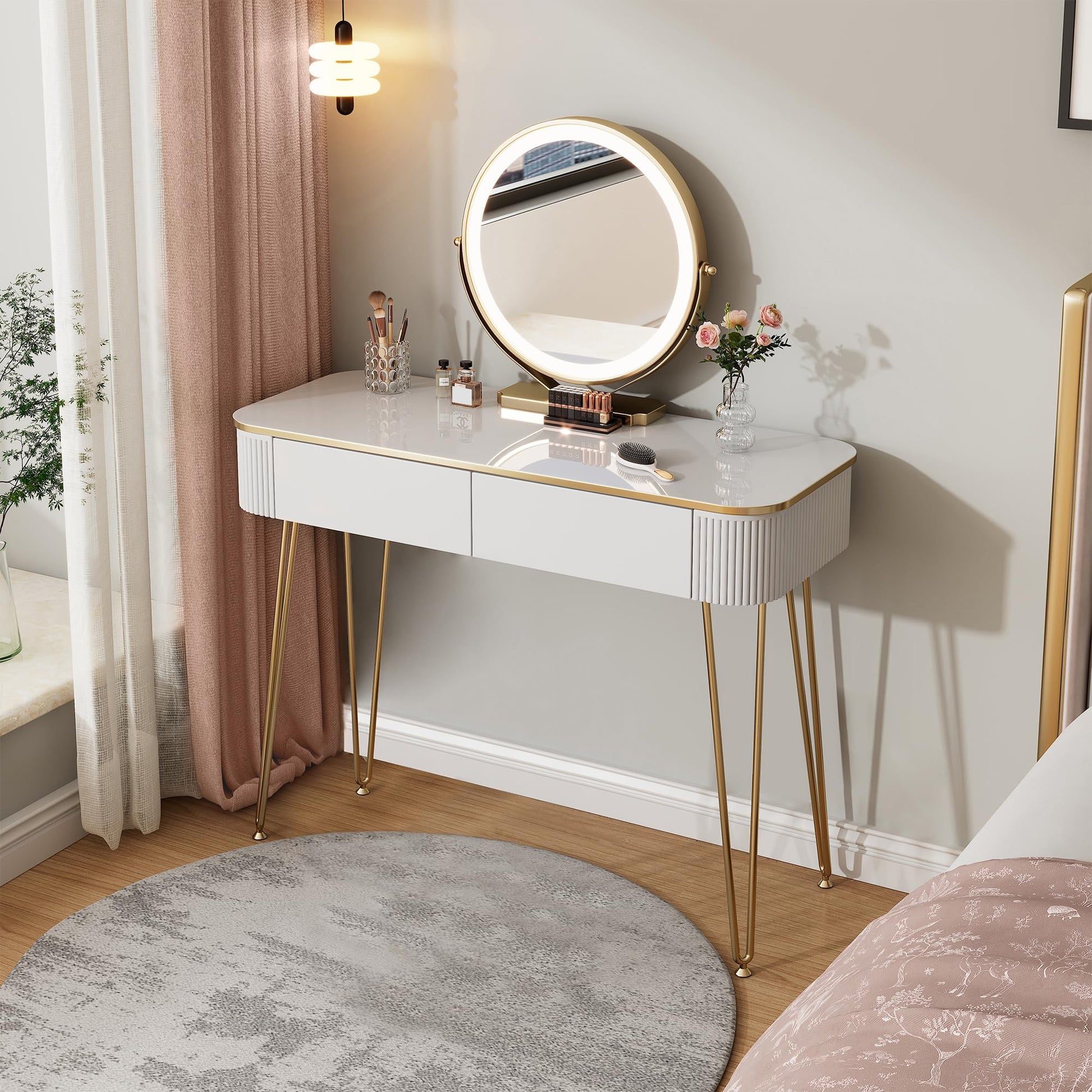 This elegant white and gold makeup vanity table combines functionality with modern design, perfect for bedrooms and compact spaces. Featuring integrated lighting and ample storage, this dressing table provides everything you need for your daily beauty routine.