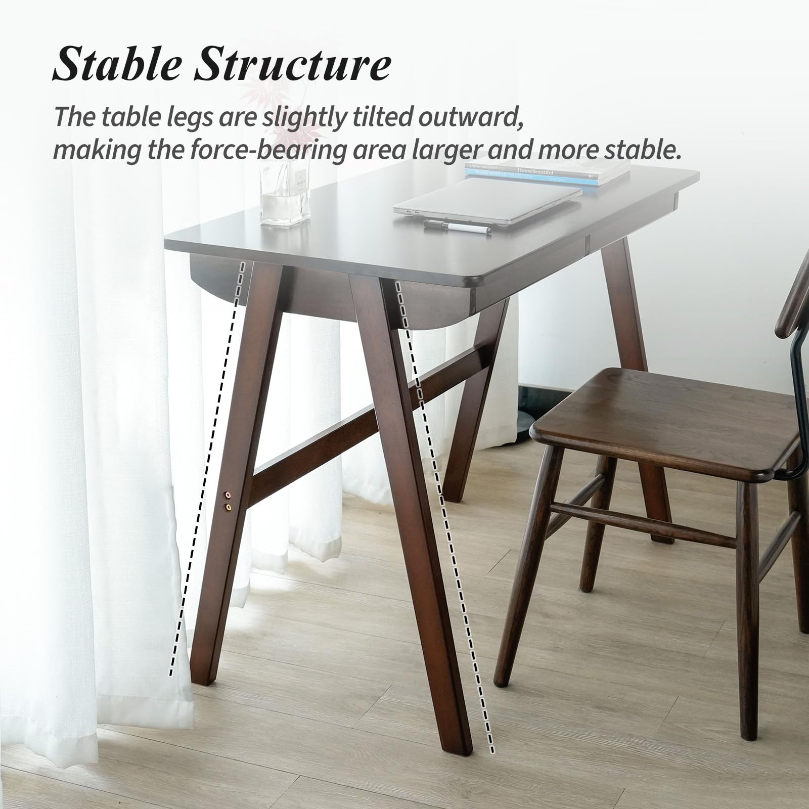 This mid-century modern writing desk combines functionality with timeless design. Crafted from solid oak wood with a rich walnut finish, it features integrated drawers for organized storage and a spacious work surface ideal for home offices or bedrooms.