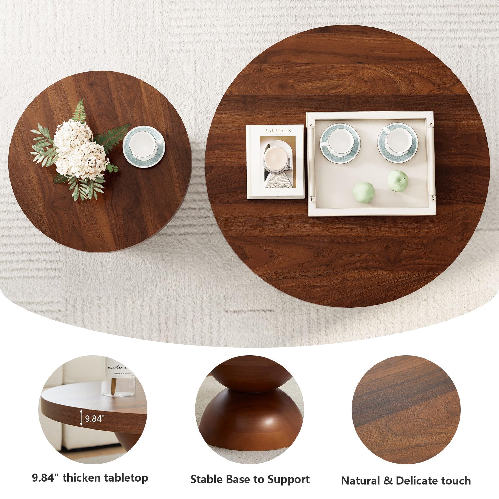 This solid wood round nesting table set of 2 serves as a coffee table, end table, or side table—ideal for small living rooms, bedrooms, apartments, or offices. Its minimalist circle top and sculptural semi-circular legs add a stylish, modern accent.