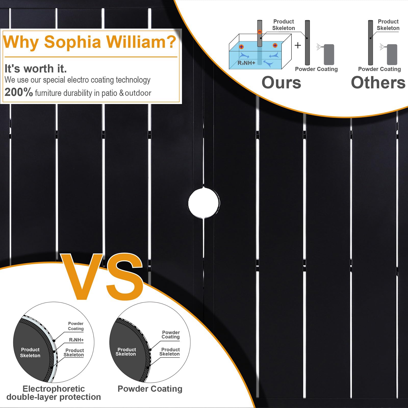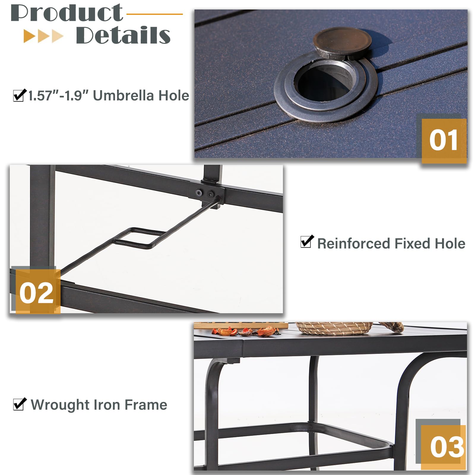 - Metal Outdoor Table: 58.9"L x 35.4"W x 28.7"H, umbrella hole: 1.57"-1.9". Spacious enough for dinner of a family of 6. Ecoating steel frame has excellent rust and weather resistant properties. One person can easily complete the installation within half an hour