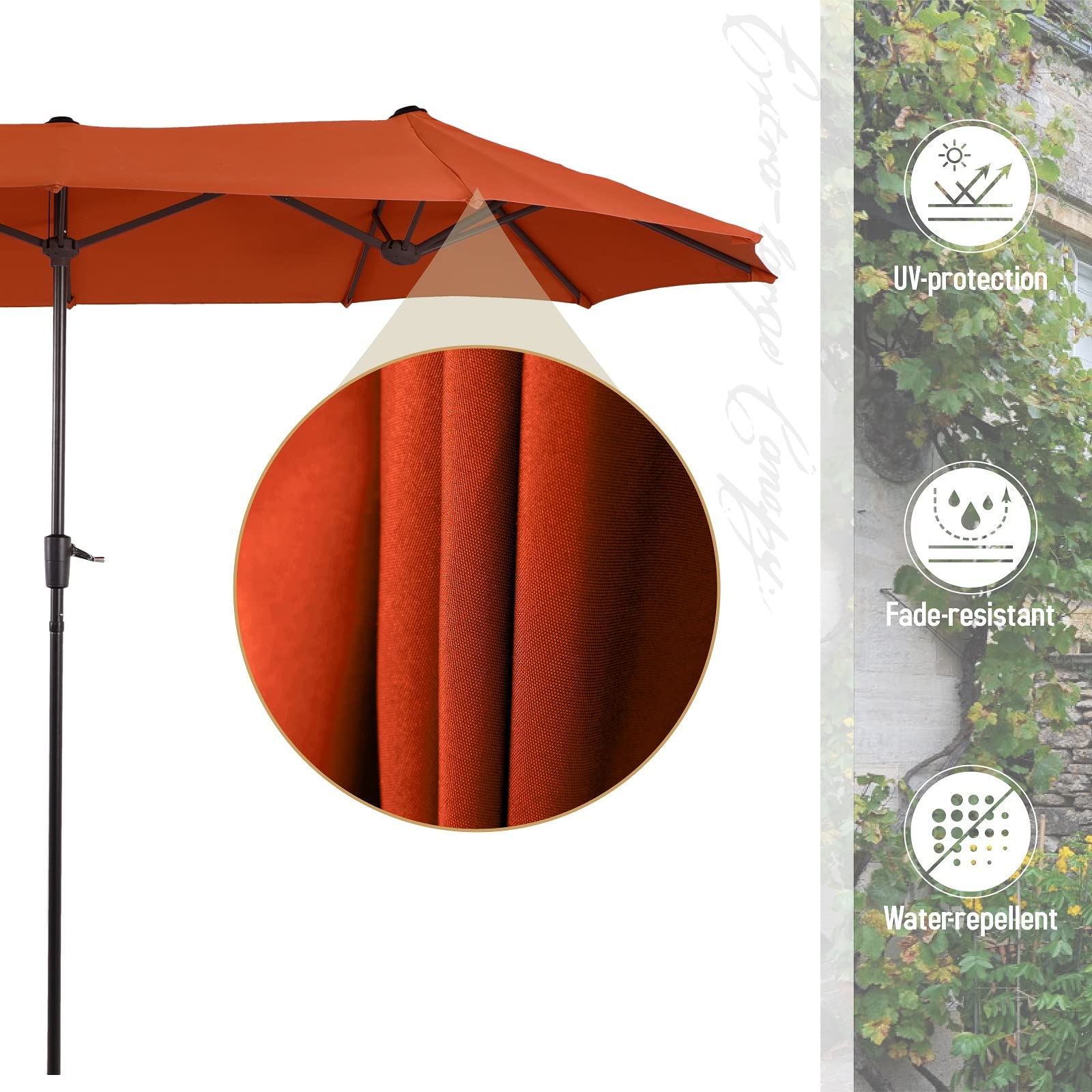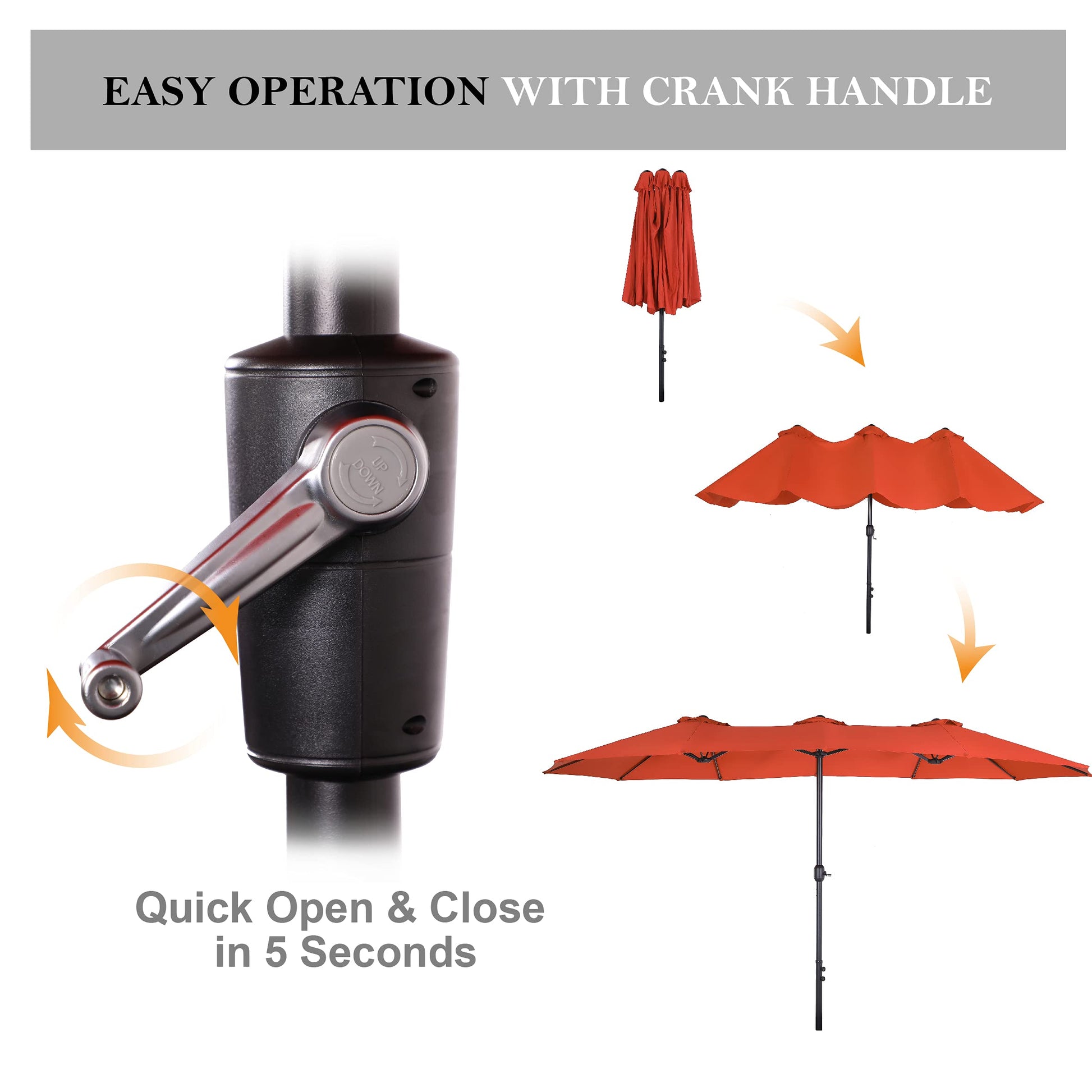 - 13 ft Patio Umbrella: It is big to provide more shading and protecting area for patio furniture. 12 steel ribs make it stable. 180G polyester fabric is fade-resistant and provides up to 99% UV protection. Crank handle make it easy to open and close. It must be CLOSED and SECURED in high wind (level 4 or higher than that). No base included