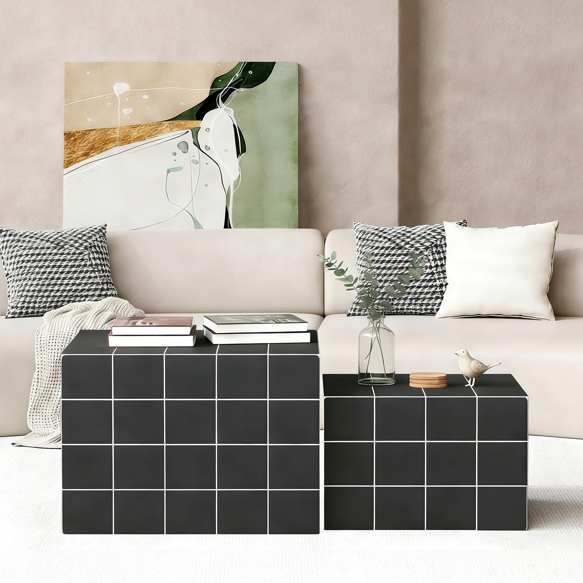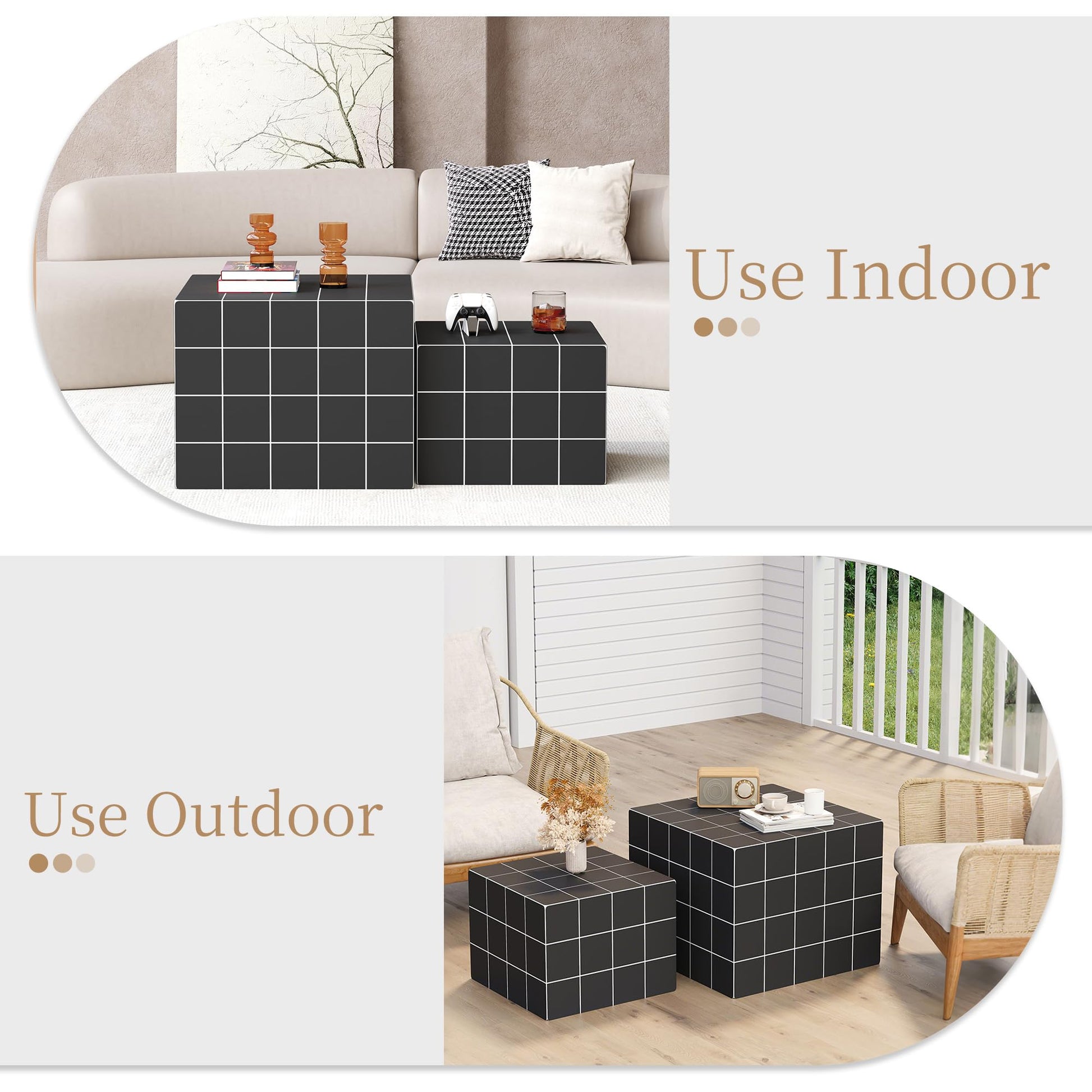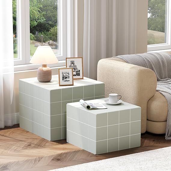 This modern nesting coffee table set features two square tables with clean lines, perfect for maximizing space in living rooms, bedrooms, apartments, dorms, and home offices. The versatile design allows use as a coffee table, end table, bedside table, leisure table, or footstool.