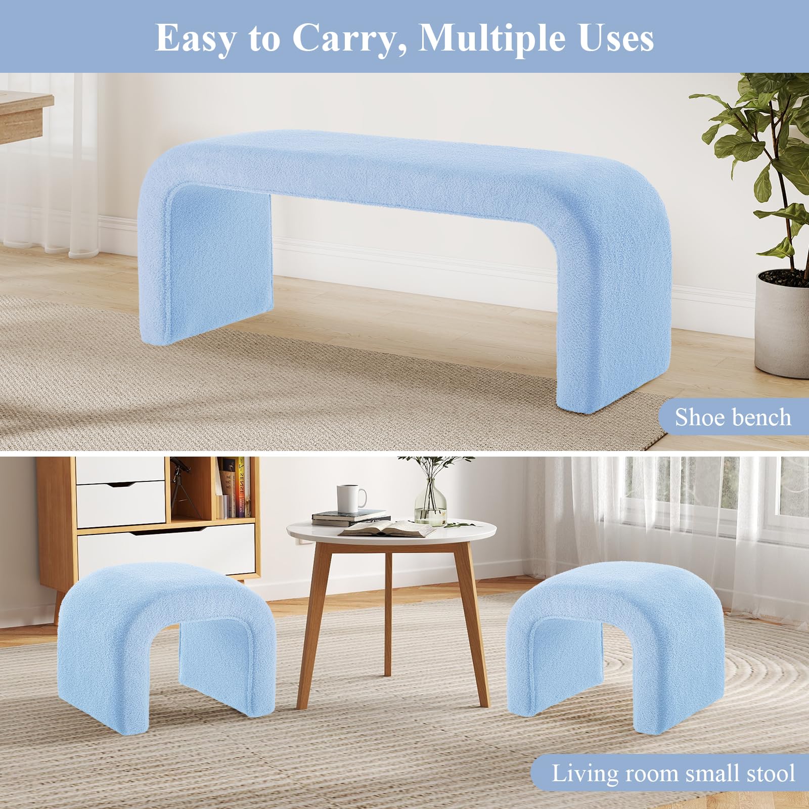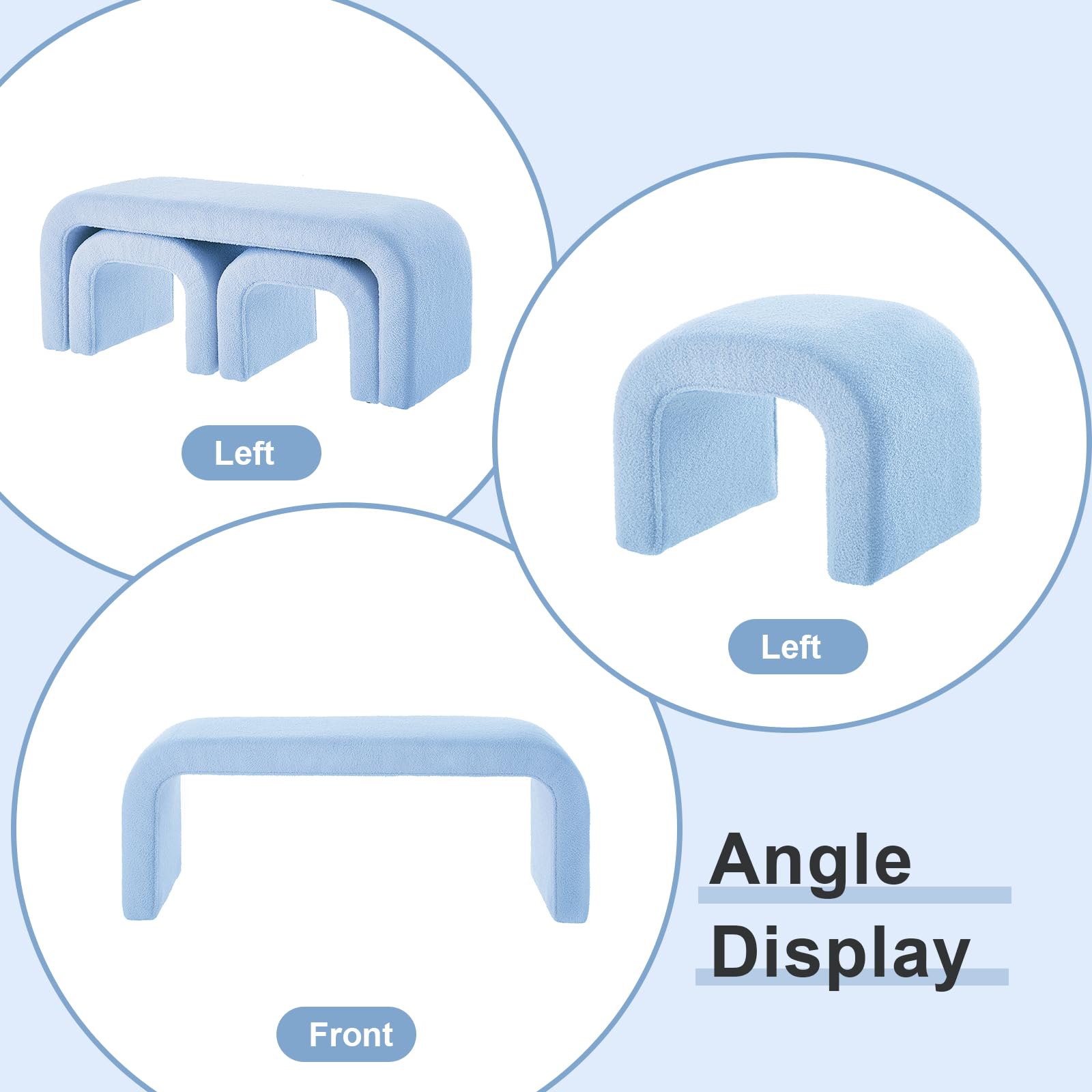 Sudwesto 3-Piece Modern Ottoman Bench Set, 44" Wide Teddy Upholstered End of Bed Bench with 2 Foot Stools, Padded U-Shaped Entry Bench Vanity Stool for Living Room Bedroom (Light Blue)