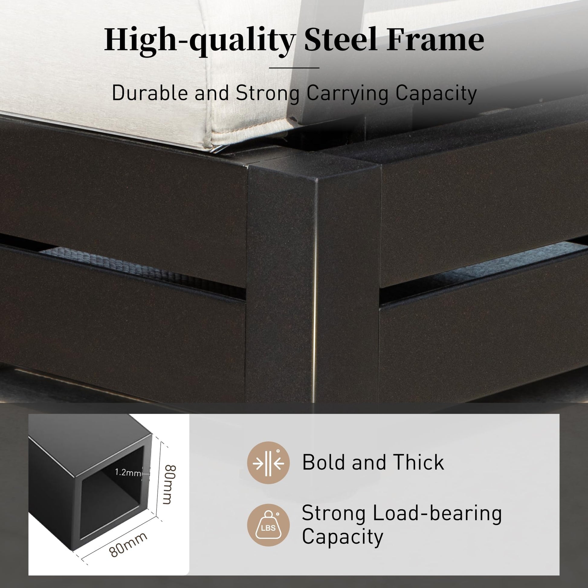 - 【Wider & Thicker Cushions】This black metal-framed patio furniture features cushions that are 27.6 inches wide and 5.9 inches thick for unparalleled comfort. Our cushions are made with high-quality 28-density foam that ensures durability and elasticity, allowing them to retain their shape and comfort over time. And our cushions come with durable Velcro for a secure fit that prevents slipping, providing both comfort and safety. Perfect for enhancing your outdoor or indoor furniture experience
