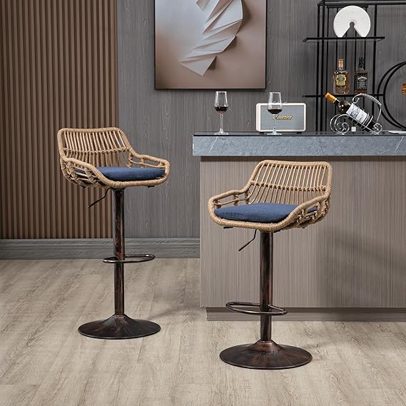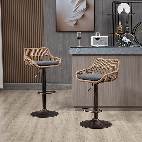 Elevate your kitchen island or dining area with these modern swivel bar stools. Featuring adjustable height functionality and a stylish wicker design, this set of 2 counter height barstools combines comfort with contemporary aesthetics.