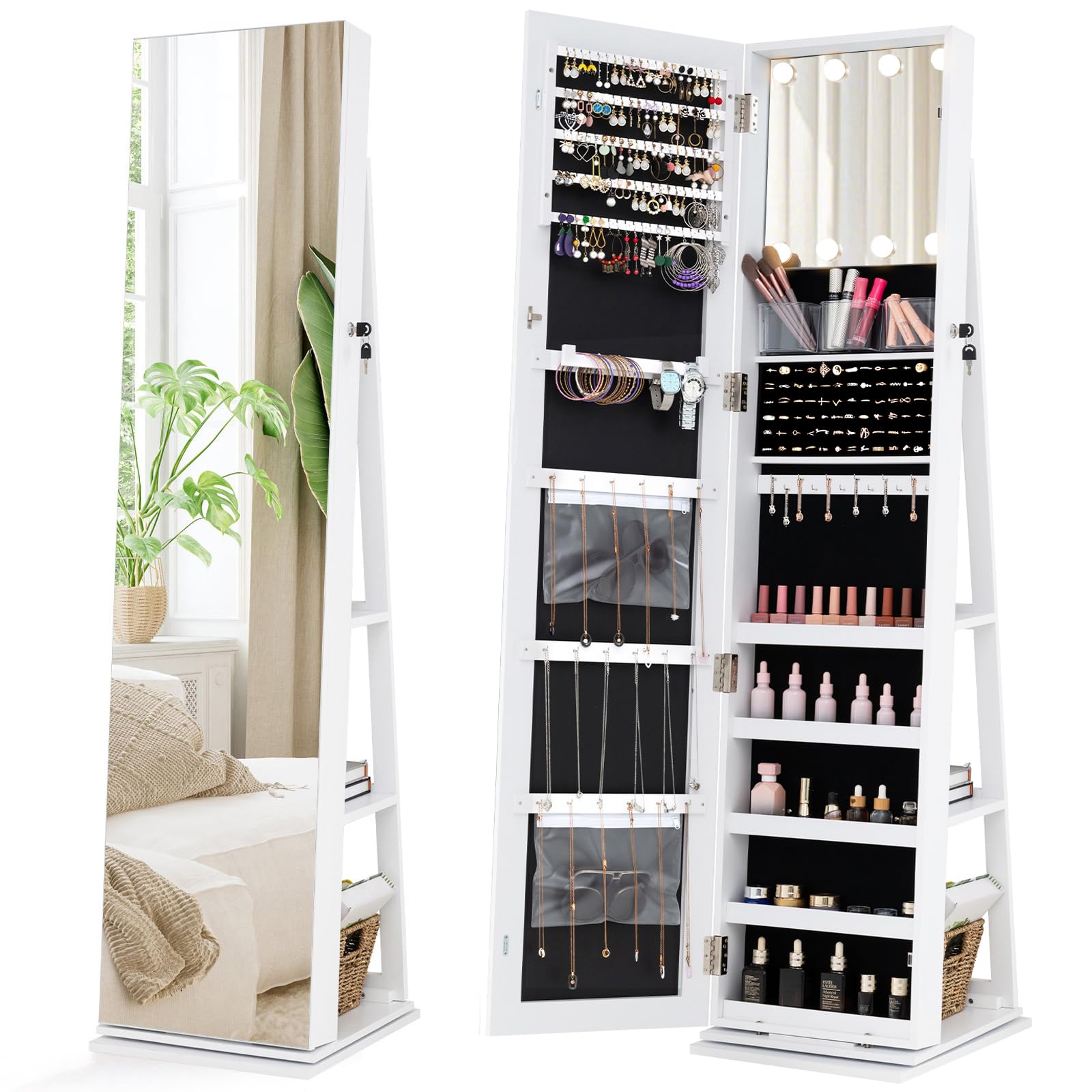 Transform your jewelry organization with this elegant 360° rotating jewelry cabinet. Featuring a full-length mirror and integrated lighted makeup mirror, this versatile armoire combines functionality with style.