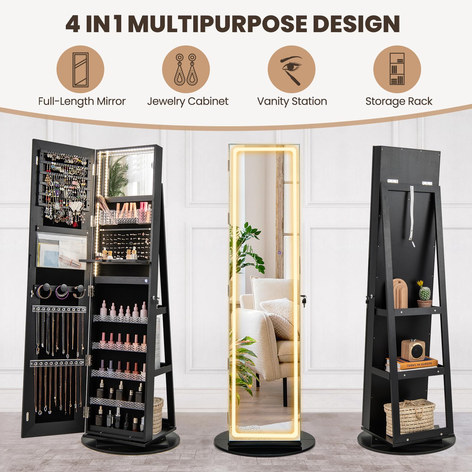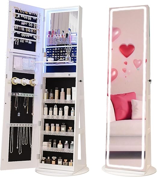 Transform your jewelry organization with this elegant full-length mirror jewelry cabinet featuring integrated LED lighting and 360° swivel functionality. This versatile armoire combines a full-length mirror with comprehensive storage solutions, making it the perfect addition to any bedroom, dressing room, or closet.