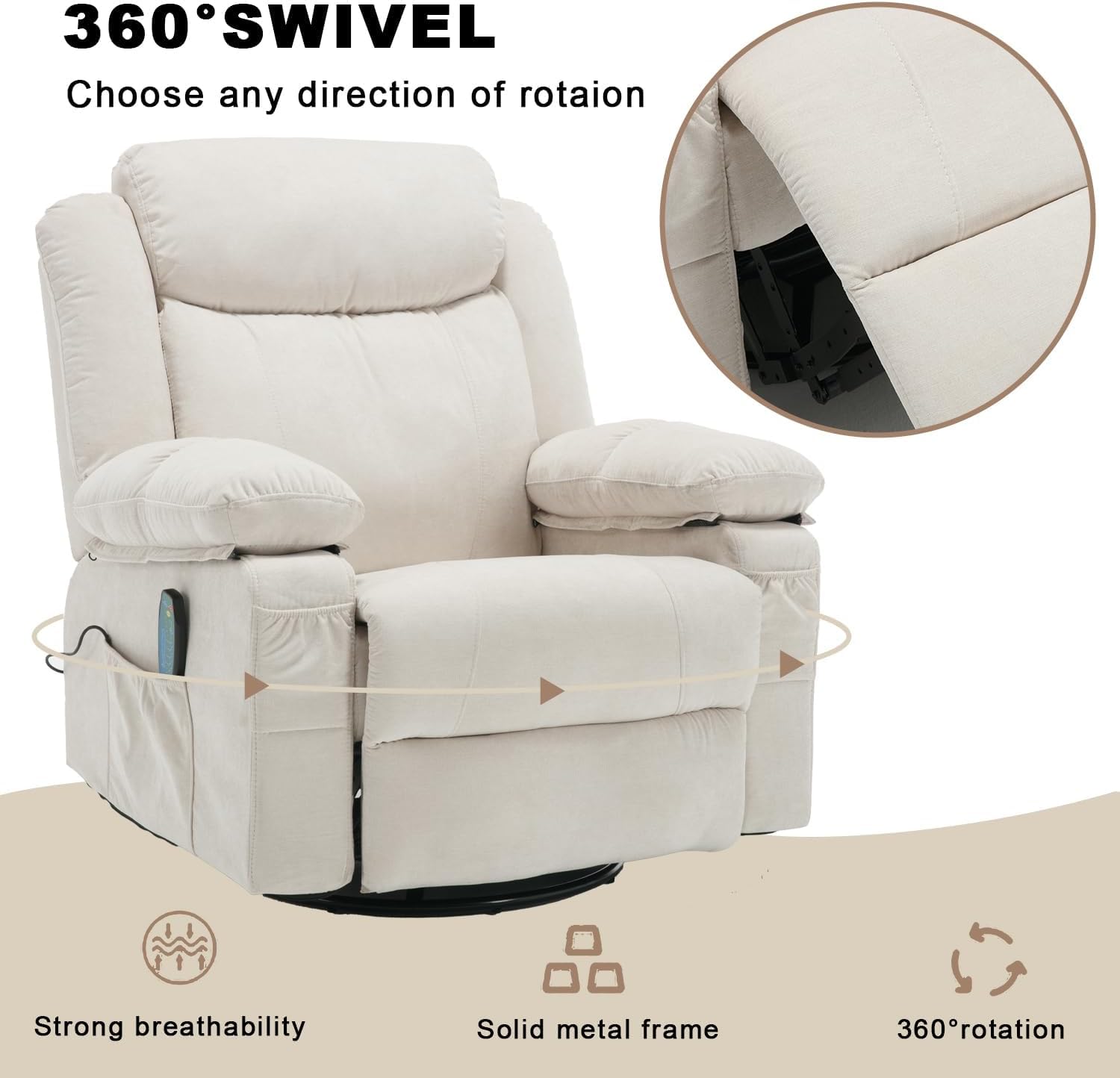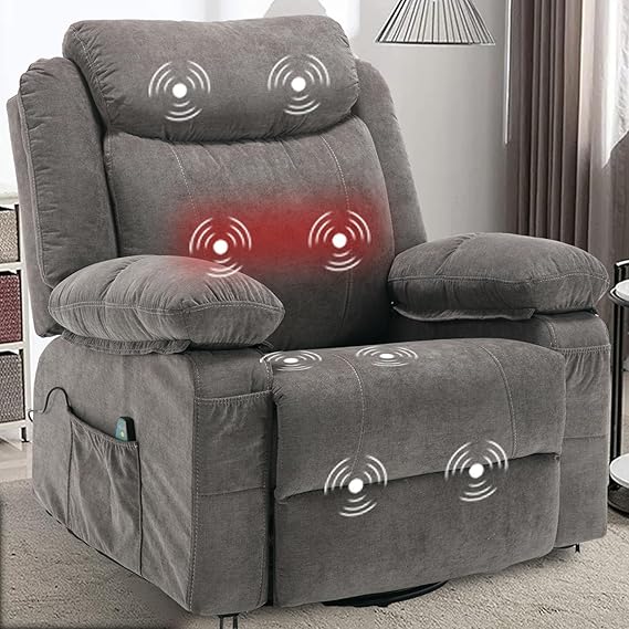 Experience ultimate relaxation with this overstuffed fabric rocking recliner designed for superior comfort and therapeutic benefits. This manual reclining chair combines massage functionality, soothing heat therapy, and smooth swivel-rocker motion to create the perfect home theater or living room seating solution.