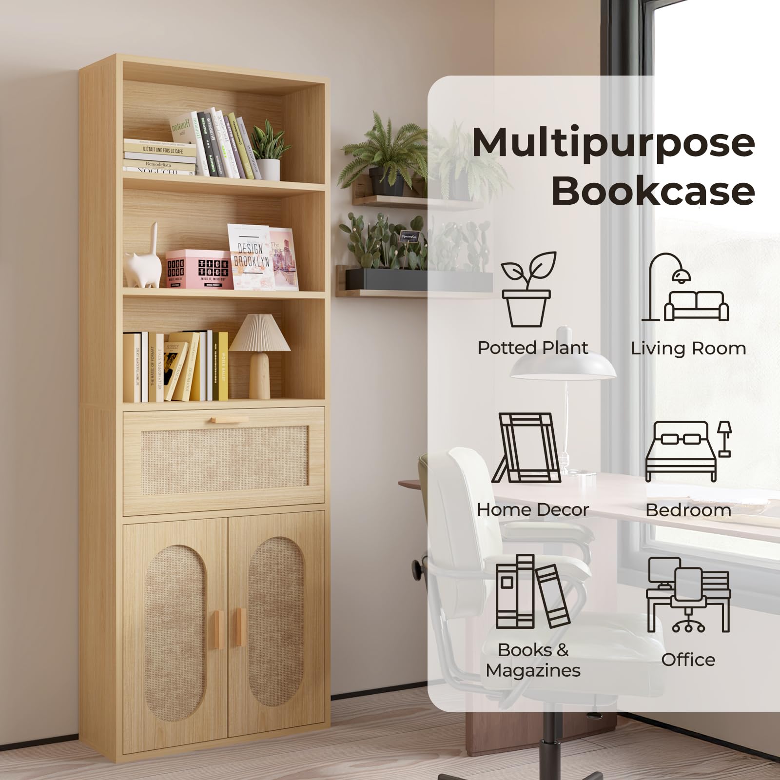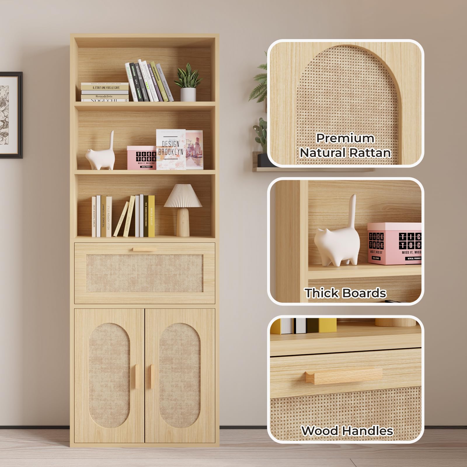 This tall storage bookcase combines modern country aesthetics with contemporary design, featuring decorative rattan doors and wood grain veneer for a natural, simple beauty. Perfect for any room in your home, this versatile cabinet offers flexible storage solutions with open shelving and enclosed compartments.
