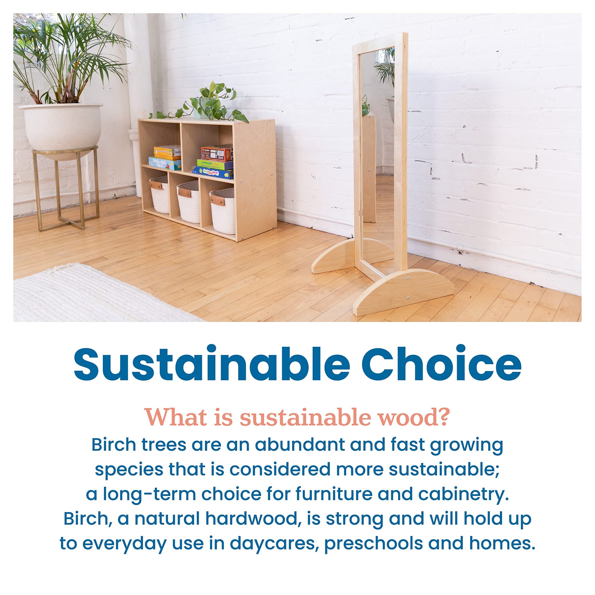 This single-sided bi-directional mirror is designed specifically for toddlers, providing a safe and engaging way for young children to explore self-recognition and spatial awareness. The natural wood frame offers durability and a warm aesthetic that complements any classroom or playroom environment.