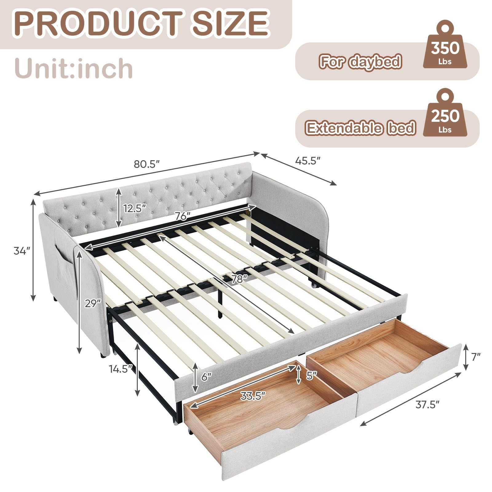 Transform your space with this versatile daybed that extends from twin to king size. Perfect for guest rooms, children's bedrooms, or multi-functional living spaces, this modern upholstered daybed combines style, comfort, and practical storage solutions.