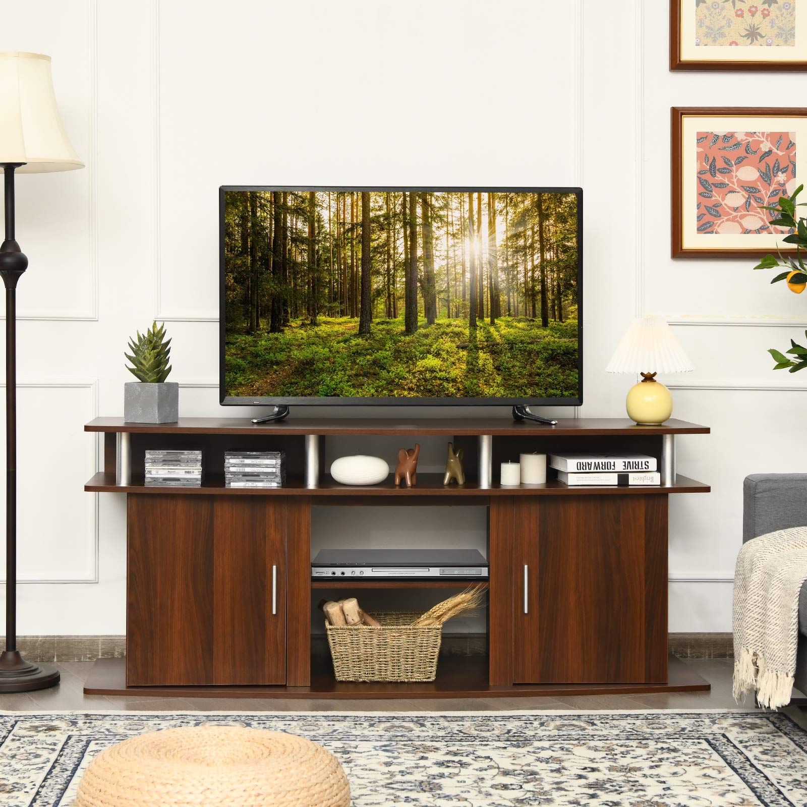 Built with solid engineered wood and reinforced by four aluminum support tubes, this TV stand ensures long-lasting durability. The tabletop safely holds up to 66 pounds, while each shelf supports up to 22 pounds. The melamine surface provides water resistance and wear protection for extended use.