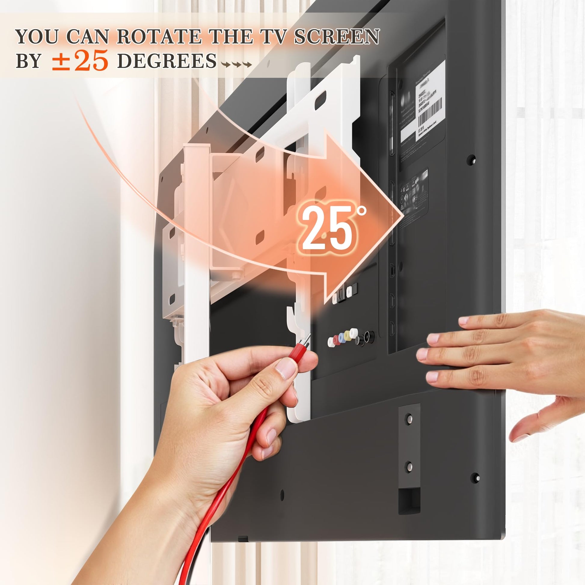 This versatile TV stand with mount accommodates screens up to 65 inches and features a swivel function that rotates 25° left or right for optimal viewing angles and easy cable access. The three-tier height adjustment system allows you to customize the screen position to your preferred viewing level.
