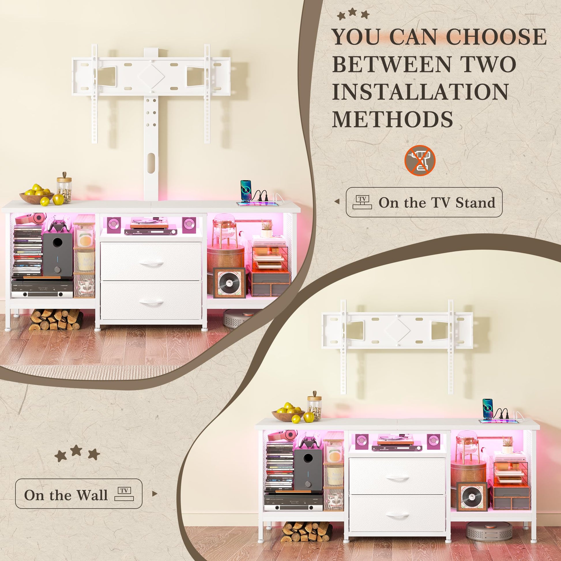 The entertainment center provides generous storage with open shelves for media devices, DVDs, gaming consoles, and books. Two fabric drawers offer convenient storage for notebooks, boxes, and discs, helping maintain an organized living space.