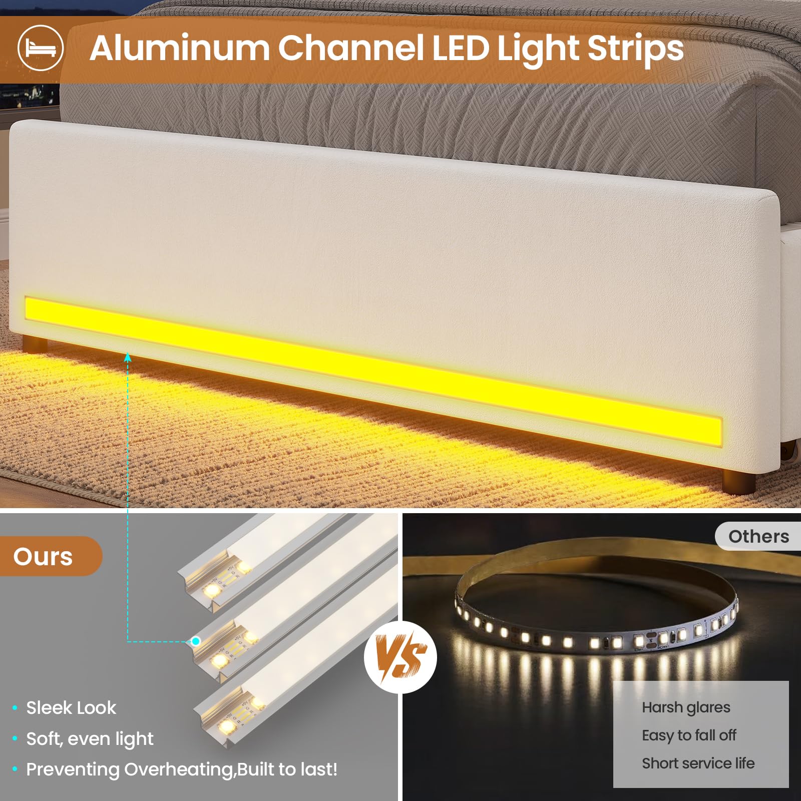 - Bookcase headboard with LED lighting for ambient illumination and convenient storage