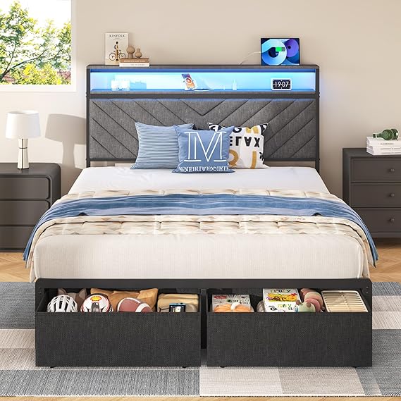 This twin bed frame combines functionality with modern design, featuring an integrated charging station, LED lighting, and convenient storage solutions. The upholstered headboard provides comfort while the sturdy metal support system ensures durability without requiring a box spring.