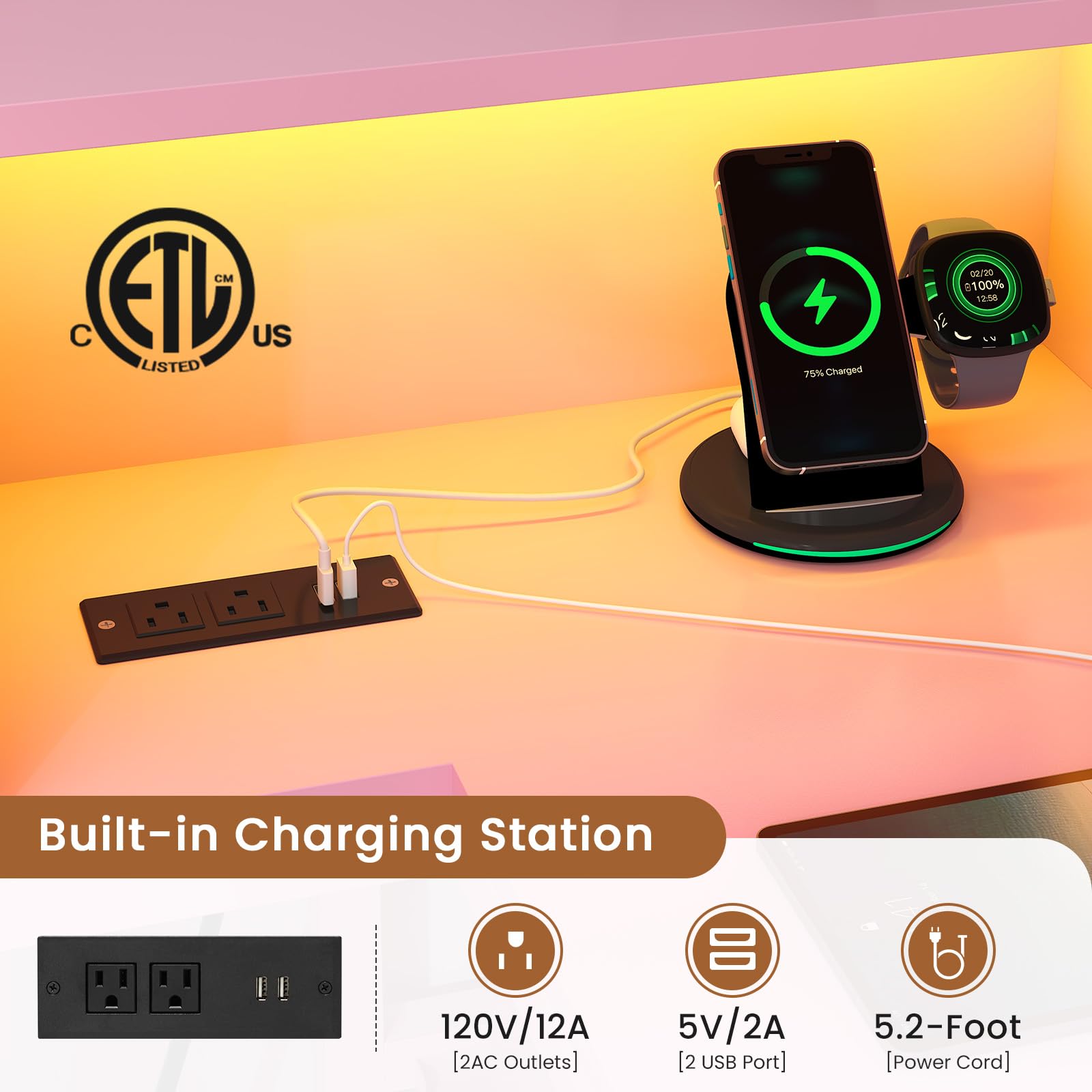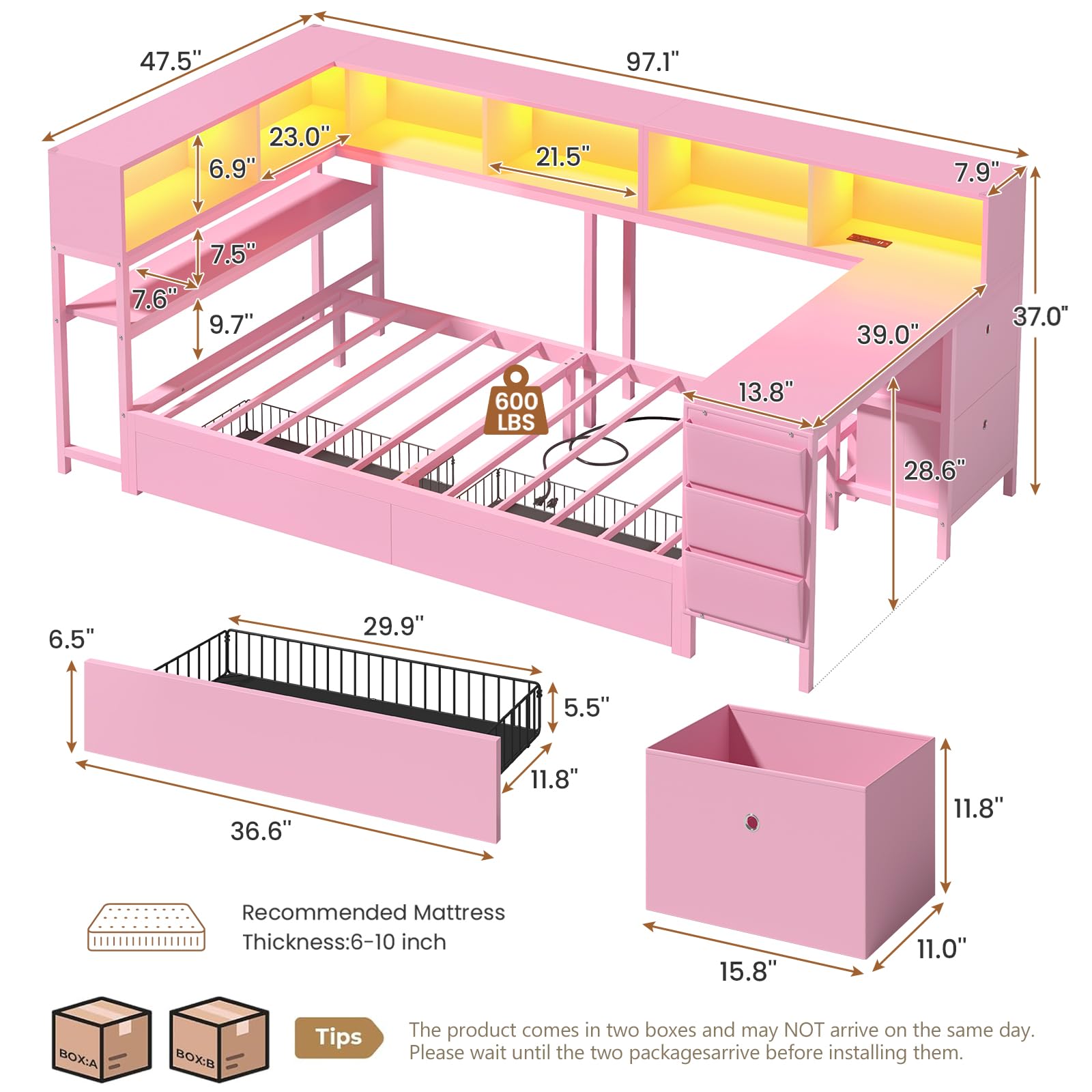 | Included Components | 2 Drawers, 2 Storage Bins, Charging Station, LED Light |