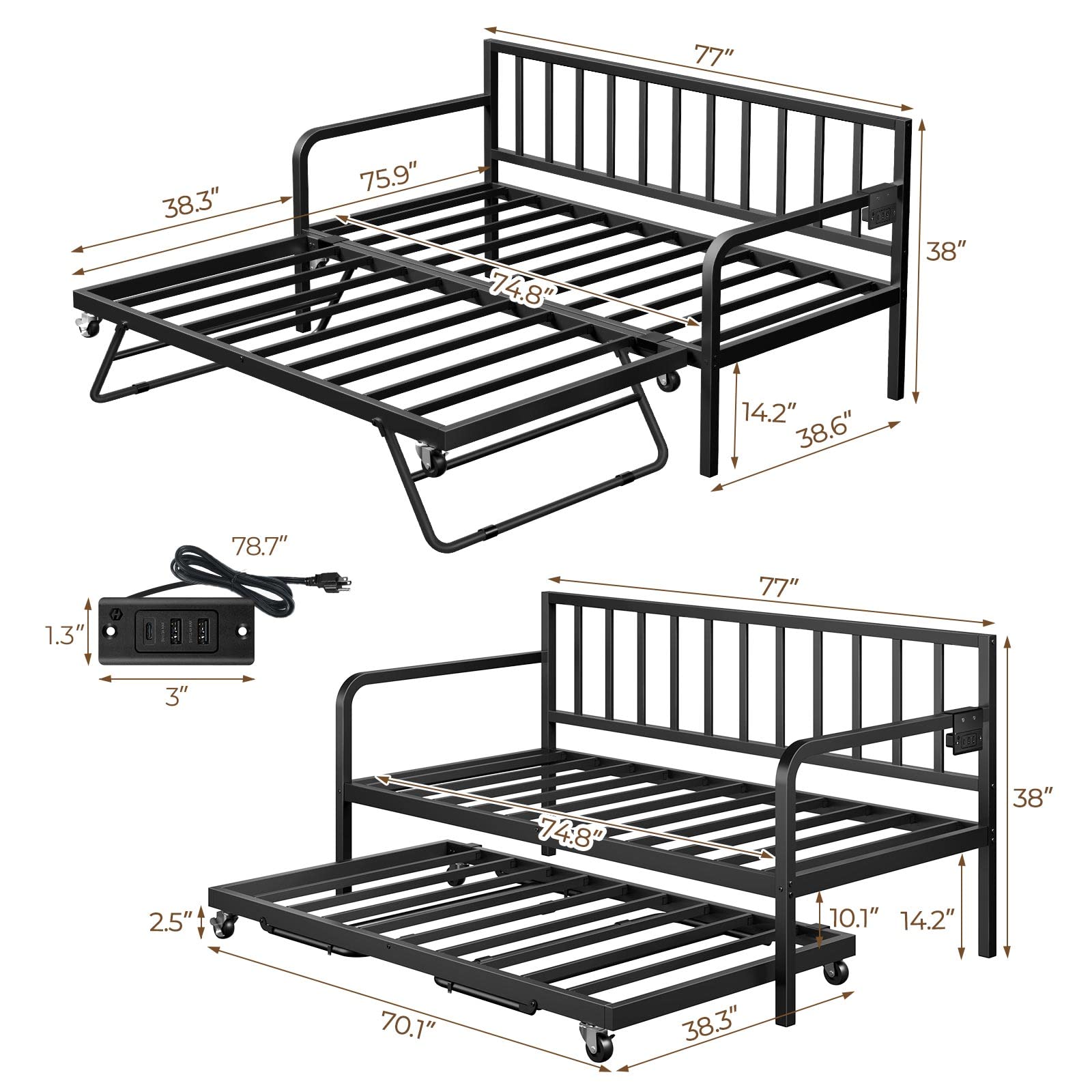 This height-adjustable twin daybed combines modern functionality with versatile design, perfect for living rooms, bedrooms, and guest rooms. The metal sofa bed frame features an integrated charging station and LED lights for added convenience.