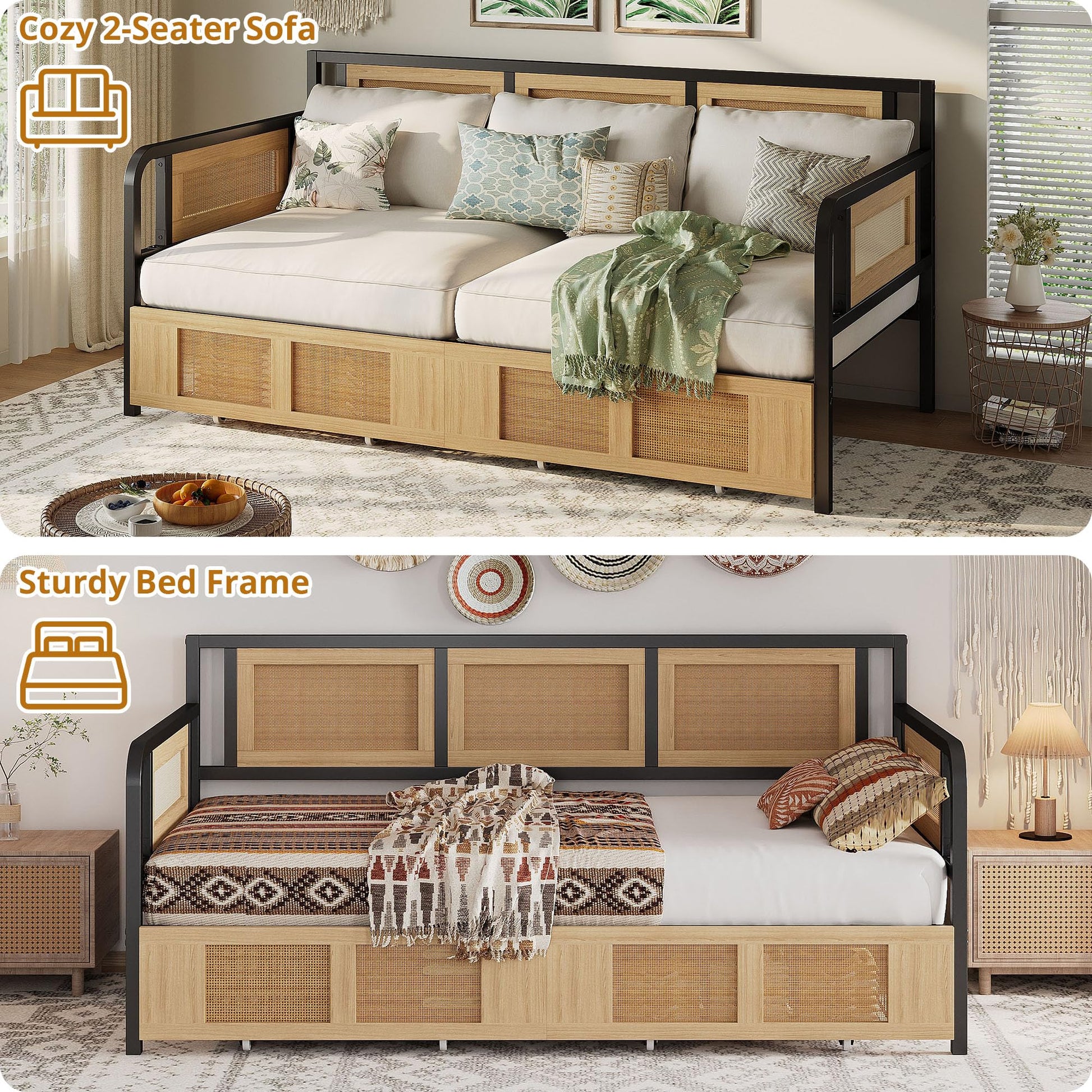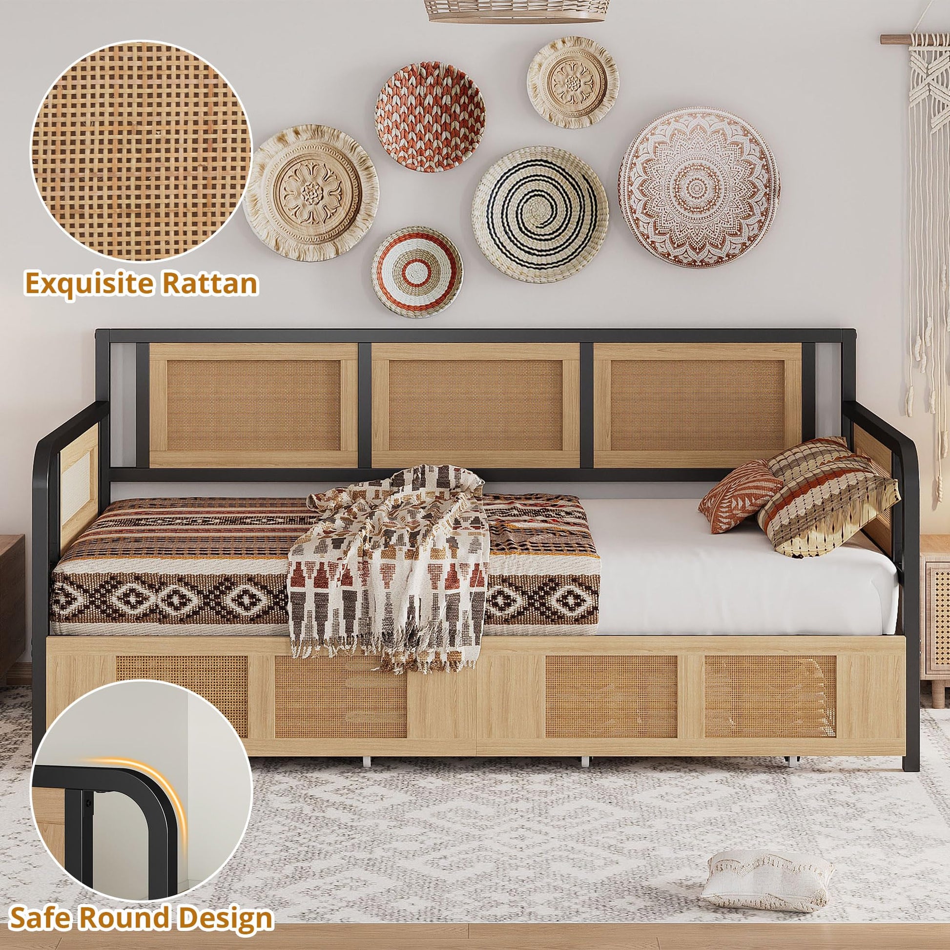 This twin daybed combines functionality with contemporary boho style, featuring integrated storage drawers and elegant rattan accents. Perfect for maximizing space in living rooms, bedrooms, or guest rooms.