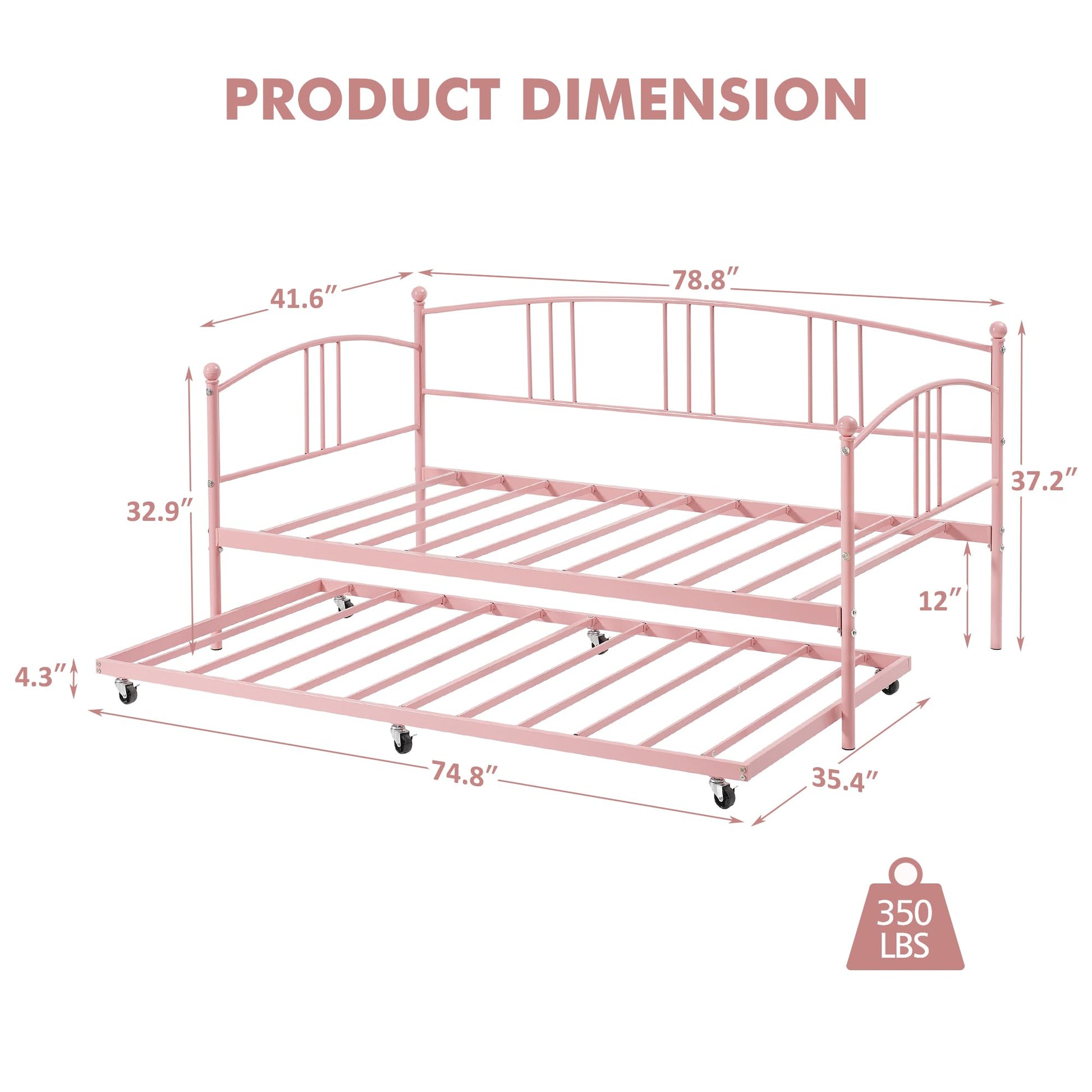 This twin daybed with pullout trundle offers versatile sleeping and seating solutions for living rooms, bedrooms, and guest rooms. The metal frame construction provides durability and stability, while the steel slat support system eliminates the need for a box spring.