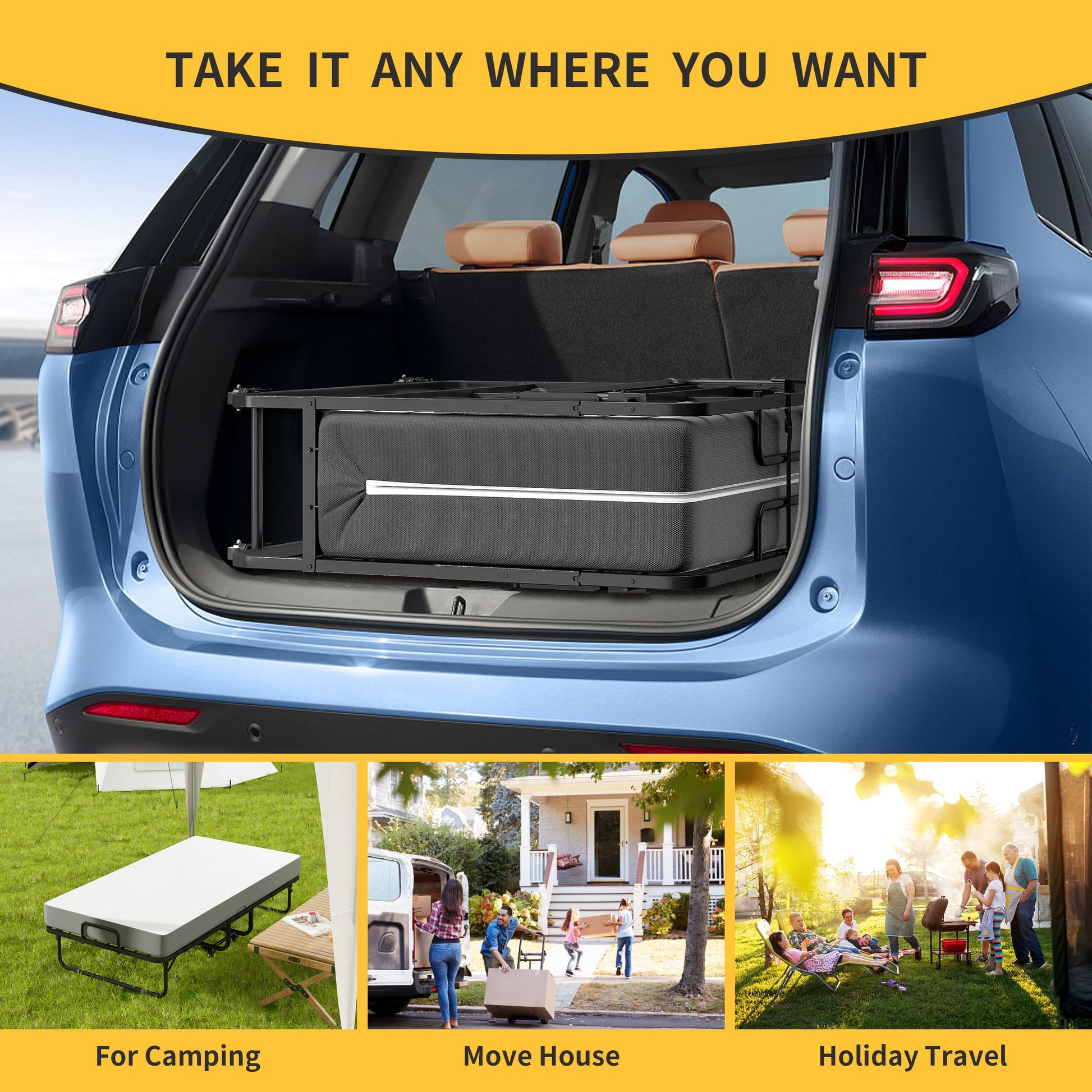 When folded, this portable bed compacts to a space-efficient size that fits easily in closets, under beds, or in corners. Equipped with four 360° rotating casters with locking mechanisms for secure positioning during use. Perfect for guest rooms, living rooms, offices, or outdoor camping.