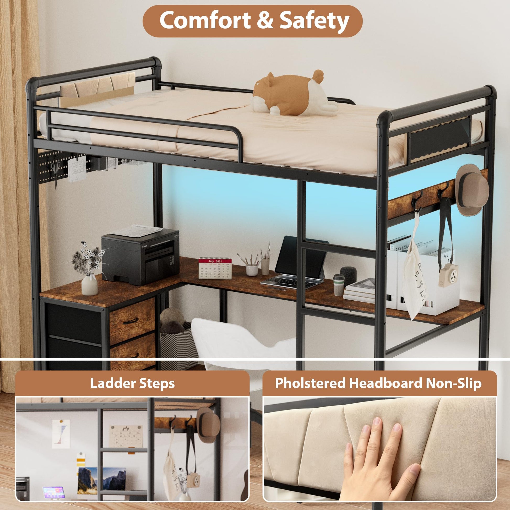 This heavy-duty metal loft bed combines functionality and style, perfect for maximizing space in bedrooms, dorms, or apartments. Featuring an integrated desk, storage drawers, and convenient charging station, this gaming-ready loft bed provides everything you need in one compact design.