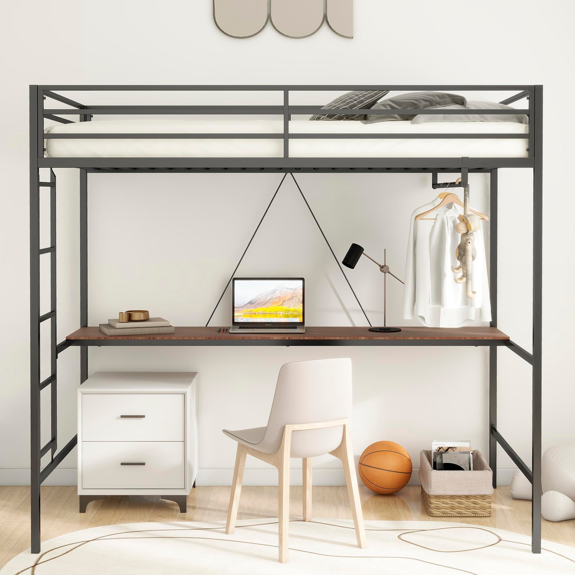 Stylish and functional twin loft bed featuring a durable steel frame with black powder coat finish. Perfect for maximizing space in kids' rooms, teen bedrooms, or small apartments.