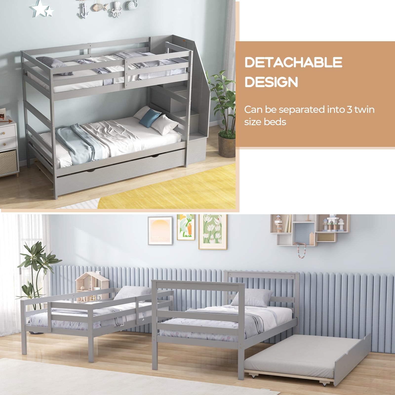 This solid wood bunk bed frame combines functionality with style, featuring a built-in trundle and convenient staircase design. The detachable configuration allows conversion into two separate platform beds, offering versatile sleeping arrangements for kids, teens, and adults.