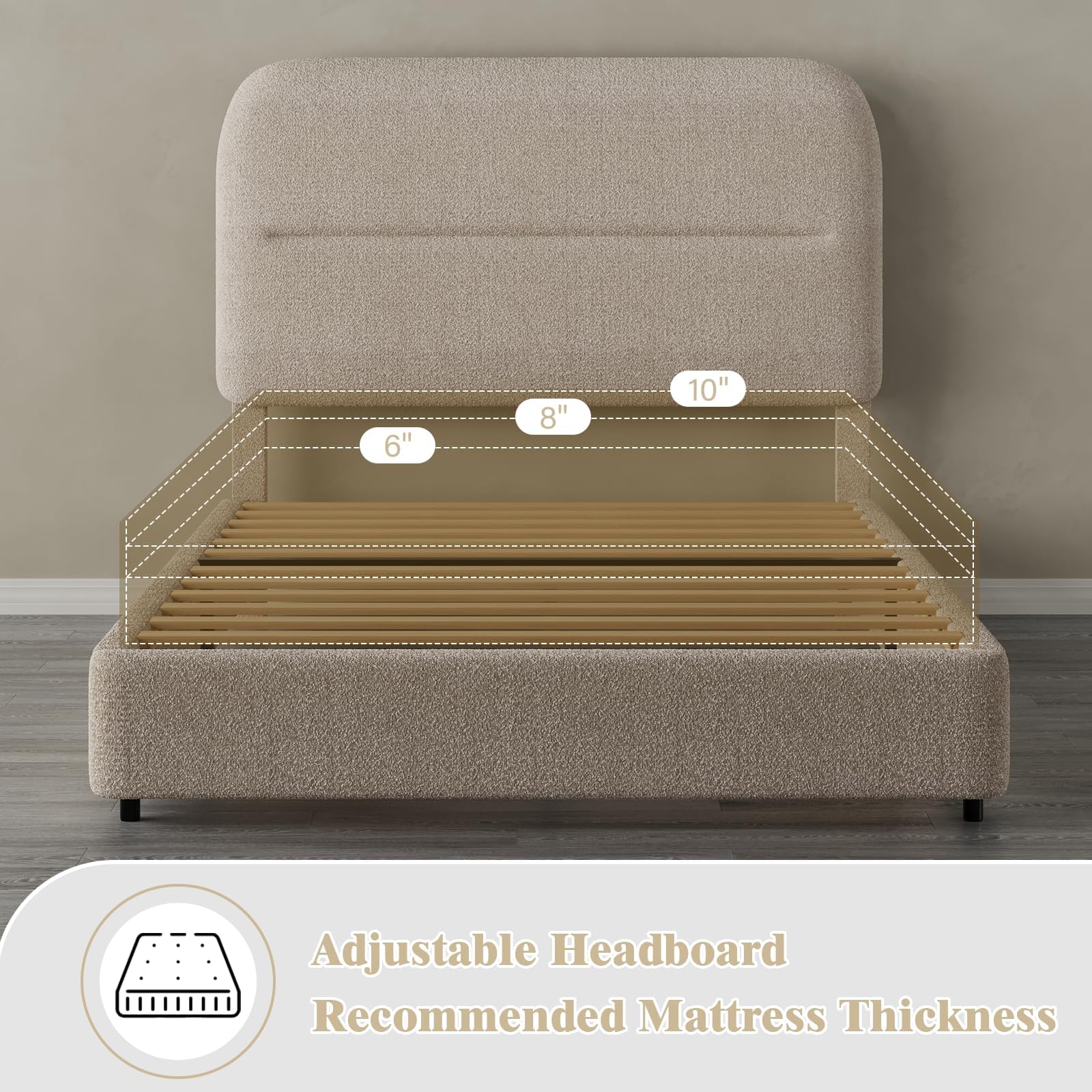 Twin Size Boucle Upholstered Bed Frame with Adjustable Headboard