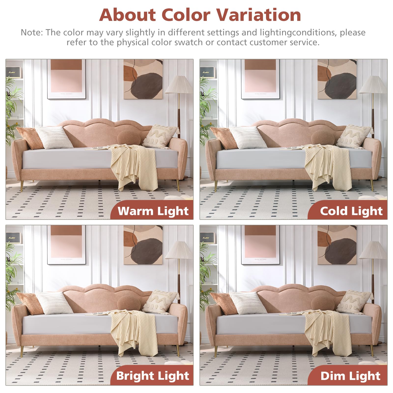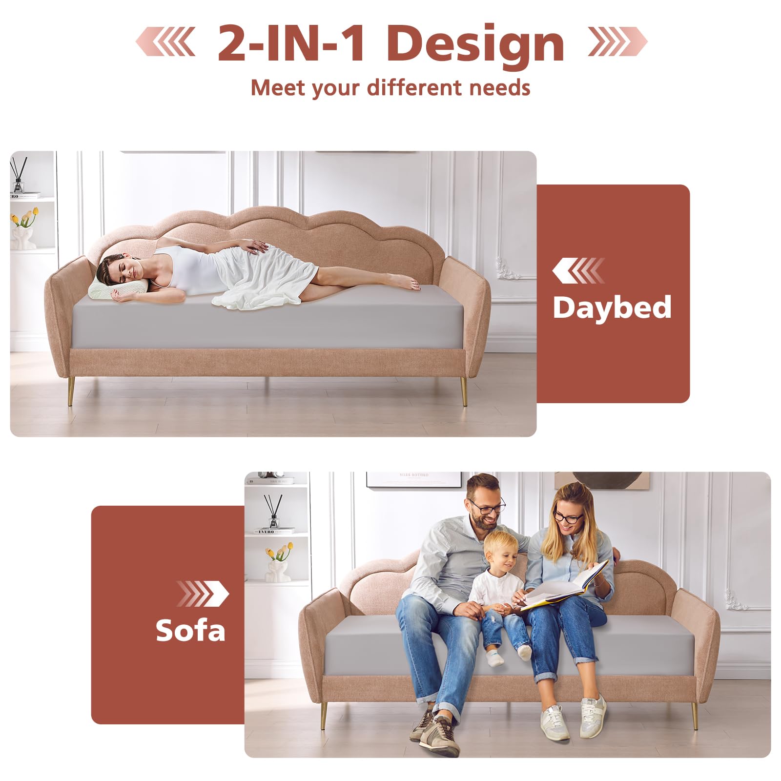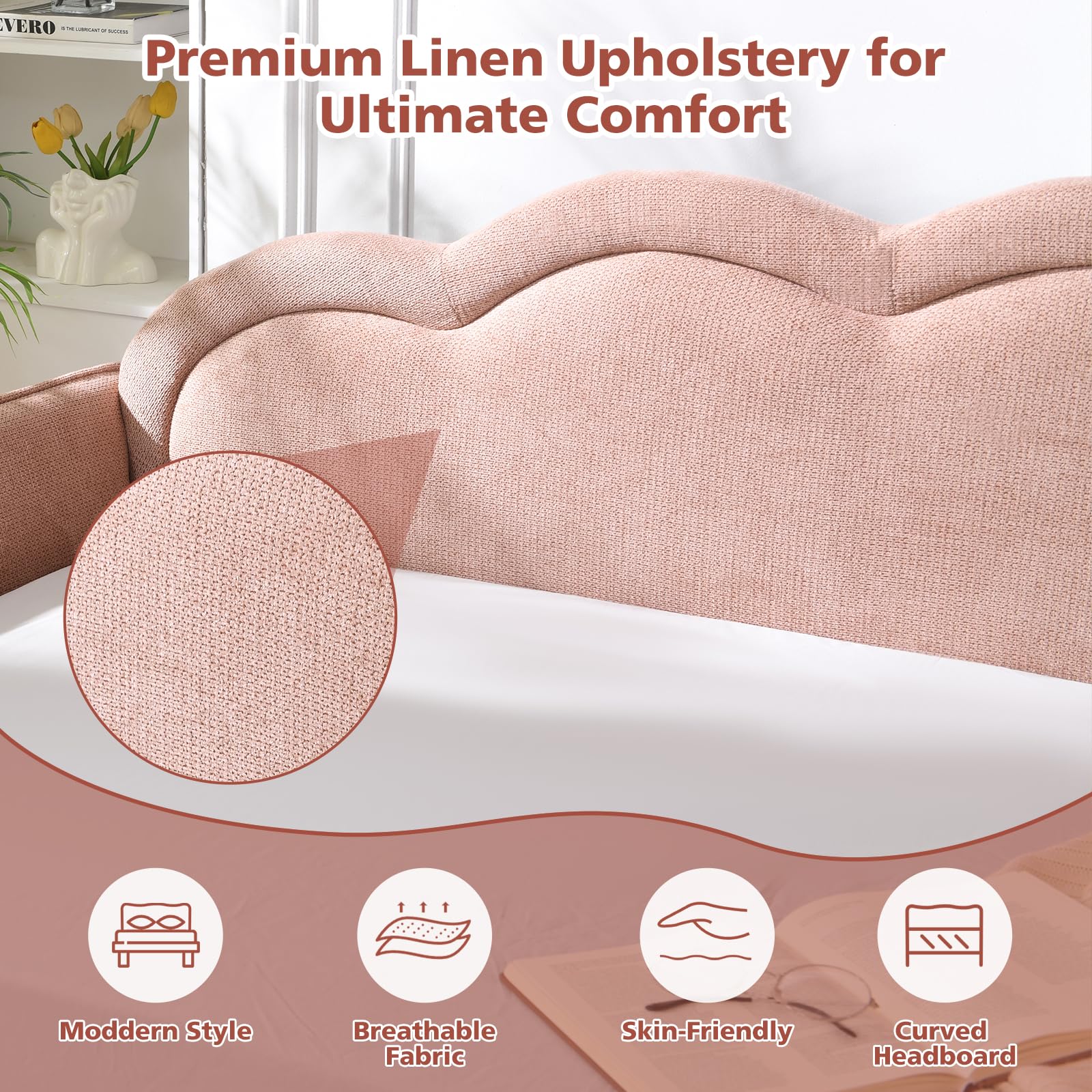 This twin-size upholstered daybed combines style and functionality with its distinctive cloud-shaped backrest design. Upholstered in premium blush pink linen fabric, it adds charm and elegance to bedrooms, guest rooms, and living spaces.