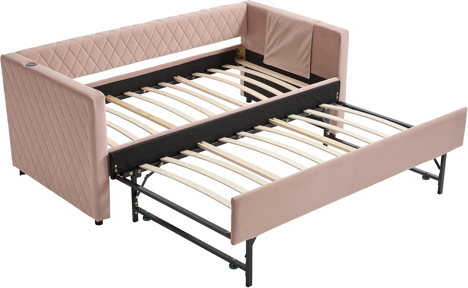 Twin Size Upholstered Daybed with Trundle and Charging Station