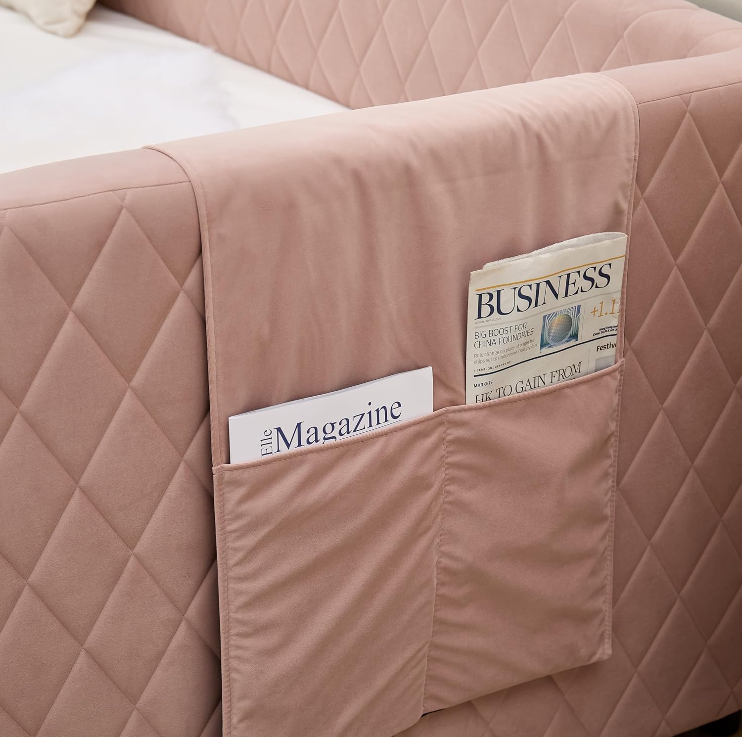 This modern twin-size upholstered daybed combines style, functionality, and space-saving design. Featuring a diamond grid velvet upholstery in green, this versatile piece functions as both a sofa and a bed, perfect for bedrooms, living rooms, or guest spaces.