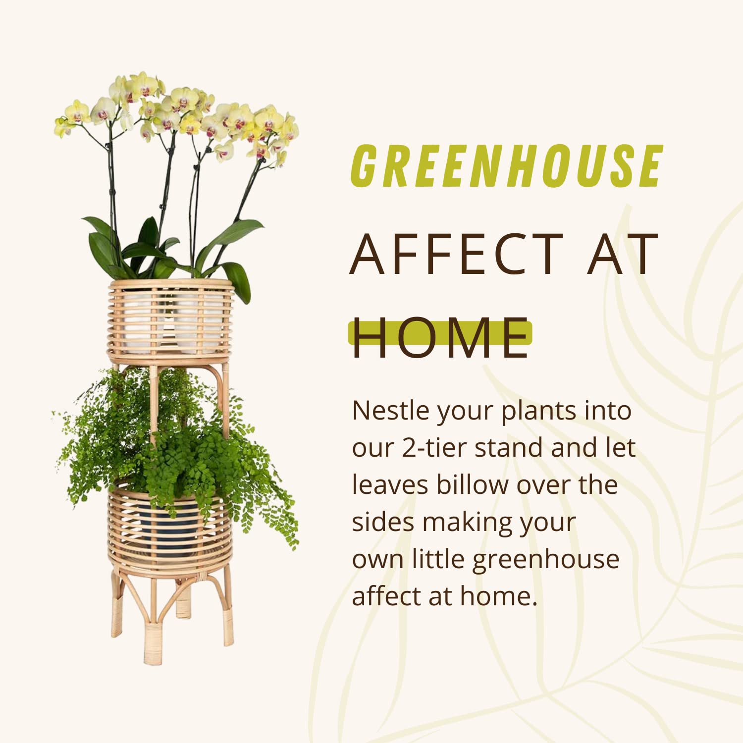 Elevate your indoor greenery with this elegant two-tier rattan plant stand. Handcrafted from natural rattan, this versatile planter brings organic warmth and texture to any living space while maximizing vertical growing space.