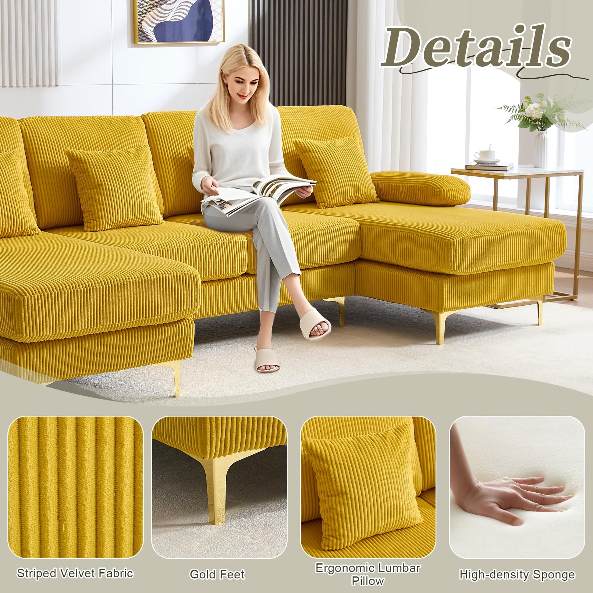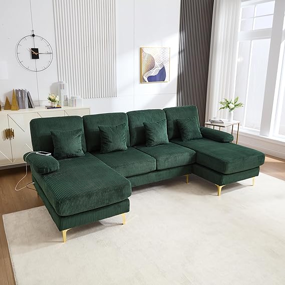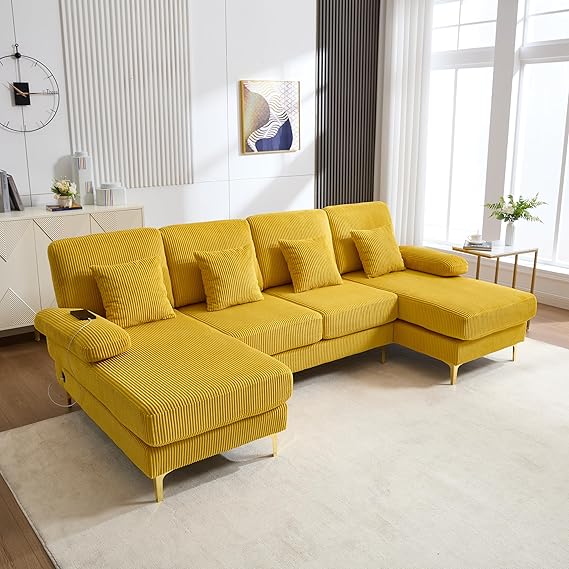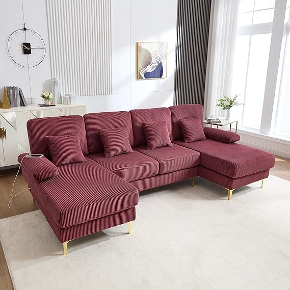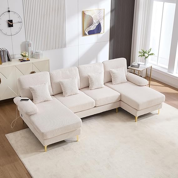 Transform your living space with this spacious 4-seat U-shaped sectional sofa. Upholstered in premium corduroy fabric, this modern sofa features a double chaise design that provides ample seating and lounging space for the entire family. Built-in USB ports and integrated lighting add contemporary convenience to classic comfort.