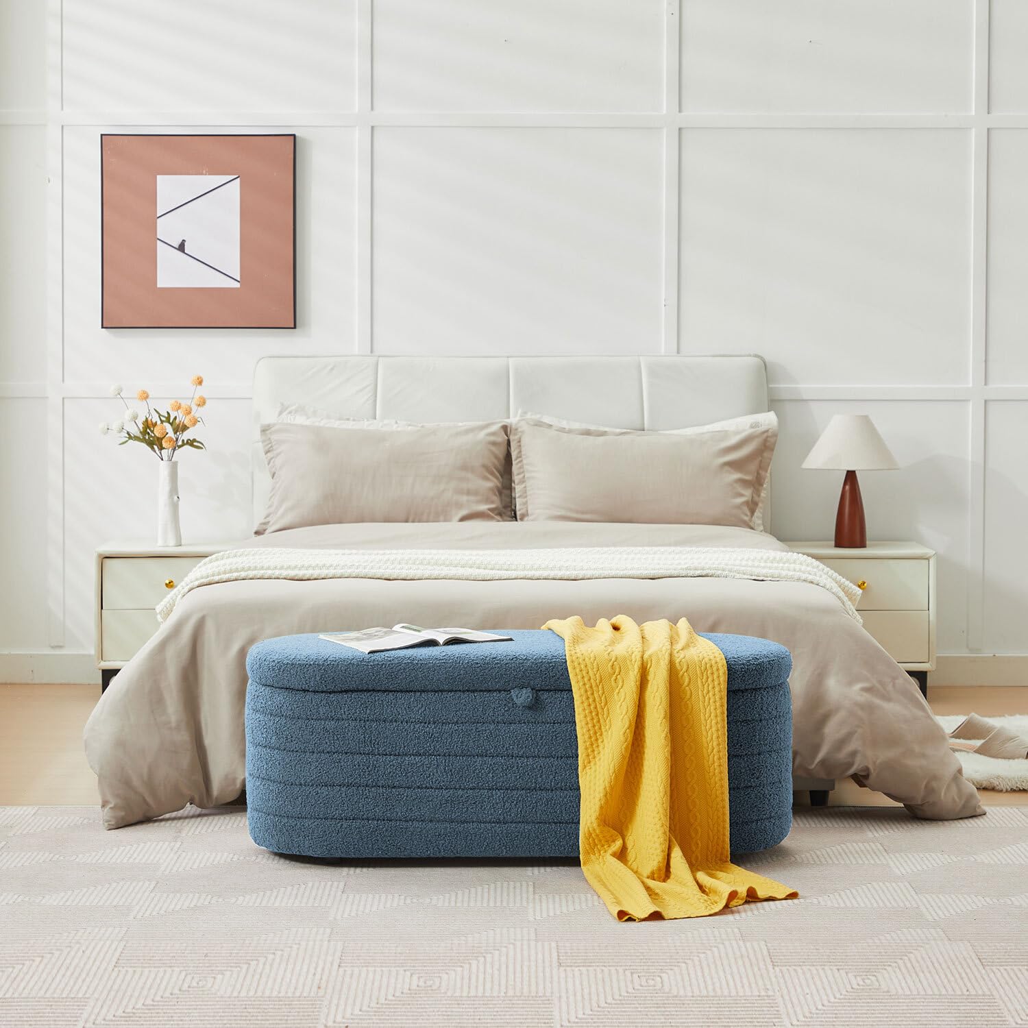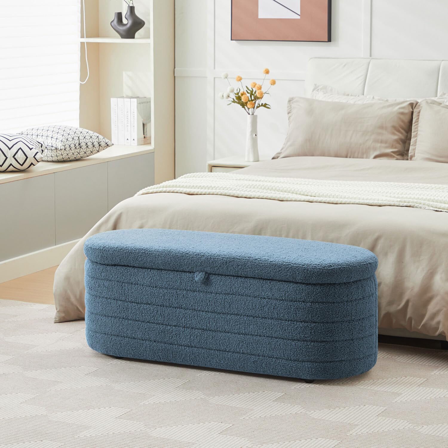 Upholstered Storage Ottoman Bench 45 Inch Blue Boucle