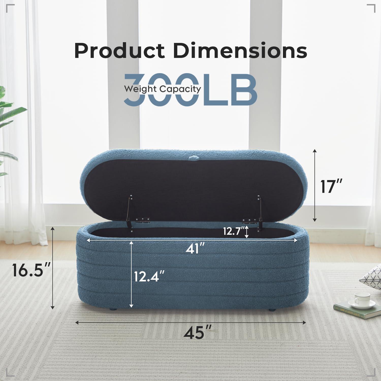 - Spacious interior storage compartment (41"L x 12.7"W x 12.4"H) accommodates clothing, pillows, shoes, bags, blankets, toys, and more