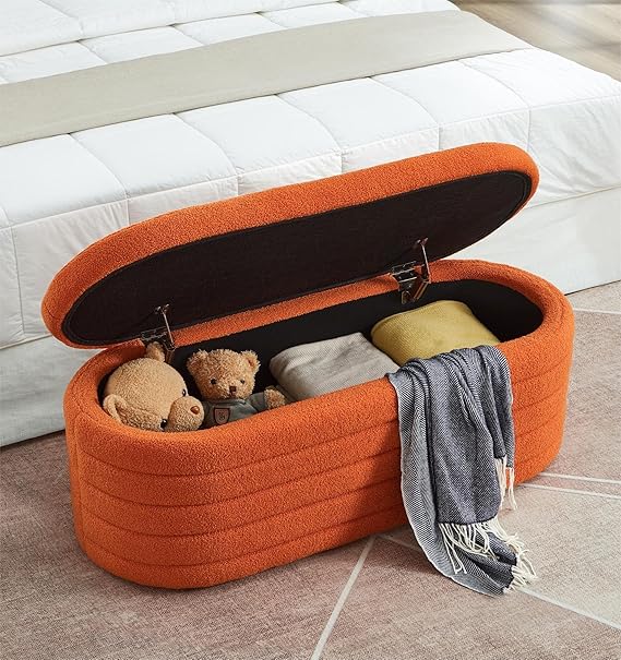 This versatile upholstered storage ottoman bench combines comfort, style, and functionality. Featuring soft boucle fabric upholstery and a spacious interior, it serves as a practical storage solution while adding a touch of modern elegance to any room.