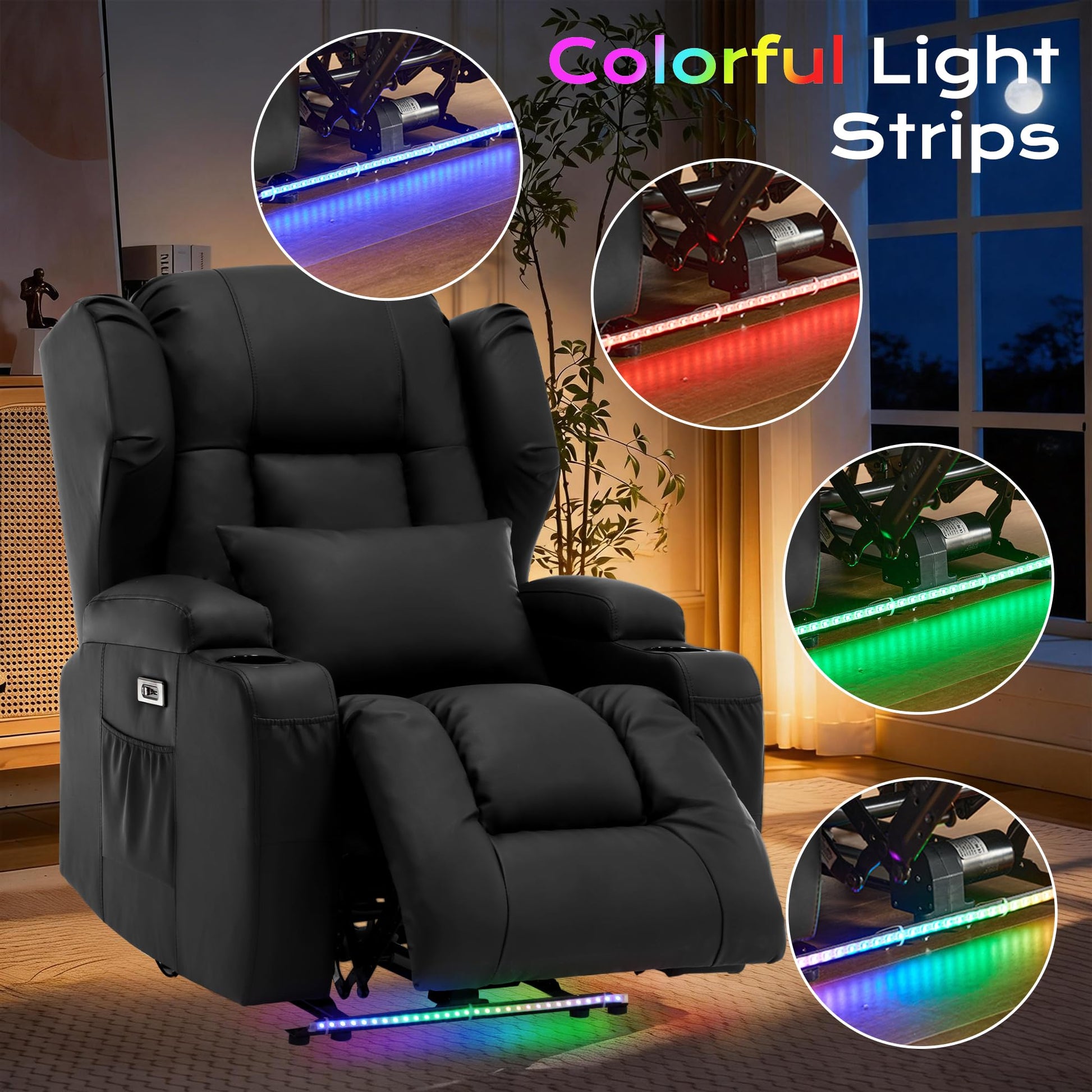 URRED Recliner Chair for Adults, Power Reclining Sofa Chair Home Theater Seating with Vibration Massage and Heat, LED Ambient Light, USB Ports, Cup Holders, Side Pockets (Black)