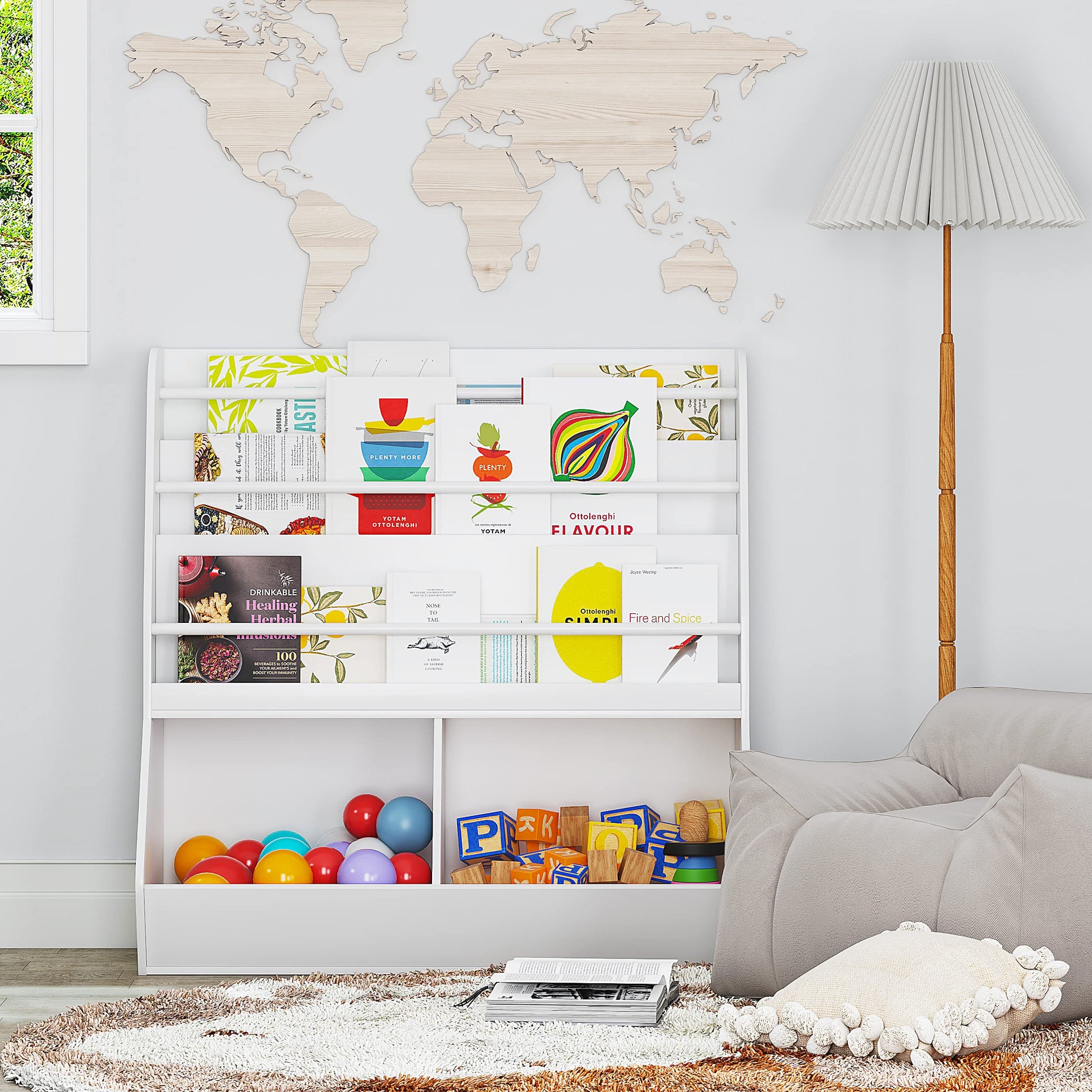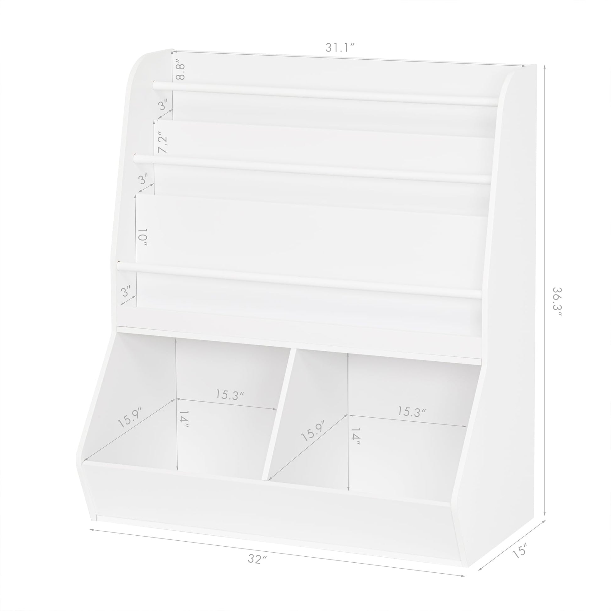 - LARGE STORAGE CAPACITY: This kid's toy storage organizer has a vast space. We are equipped with 3 book racks and shelves and 2 large storage compartments, you can place your books in the top display area and the bottom storage cubbies can store toys, magazines, blocks, etc.