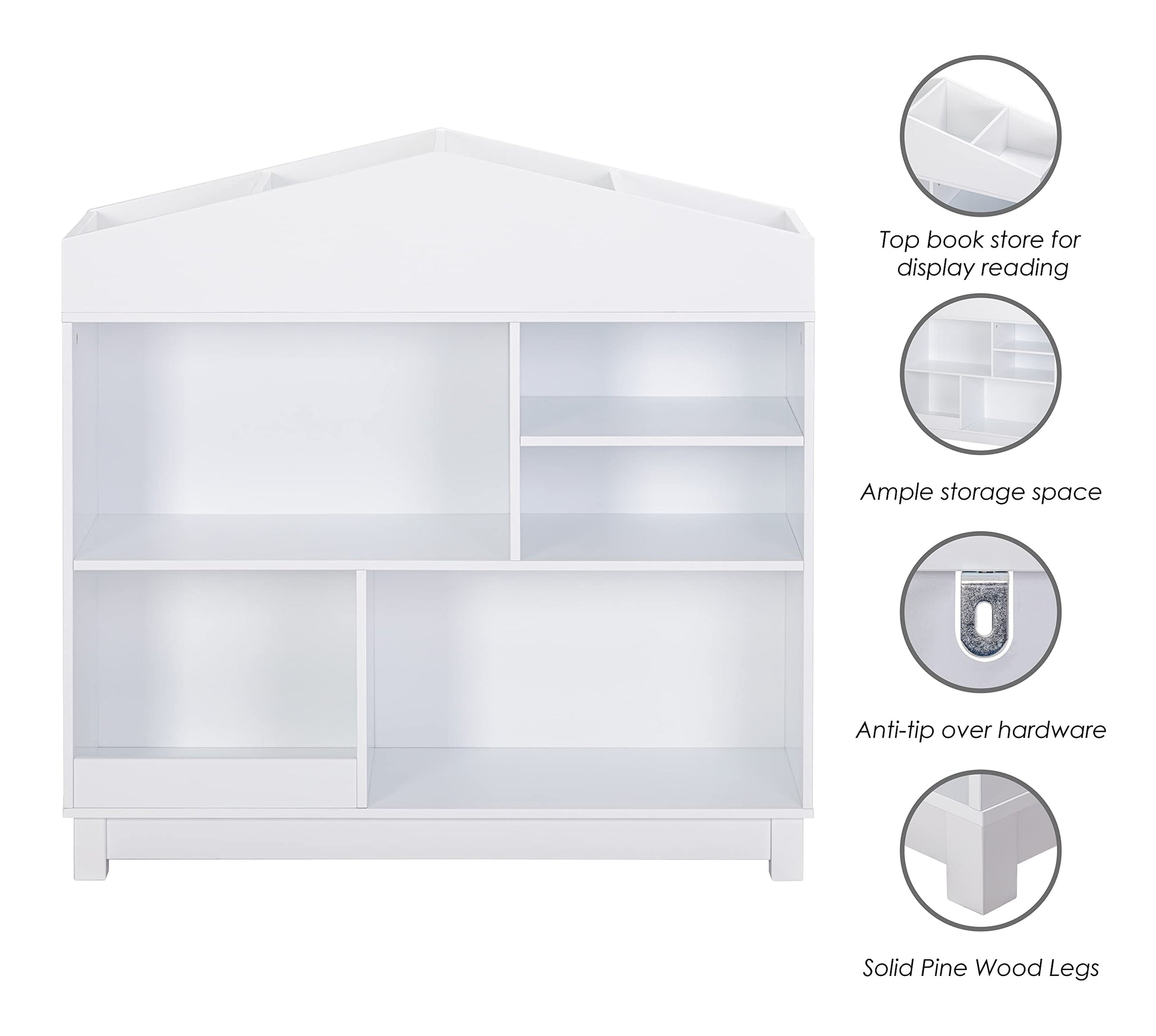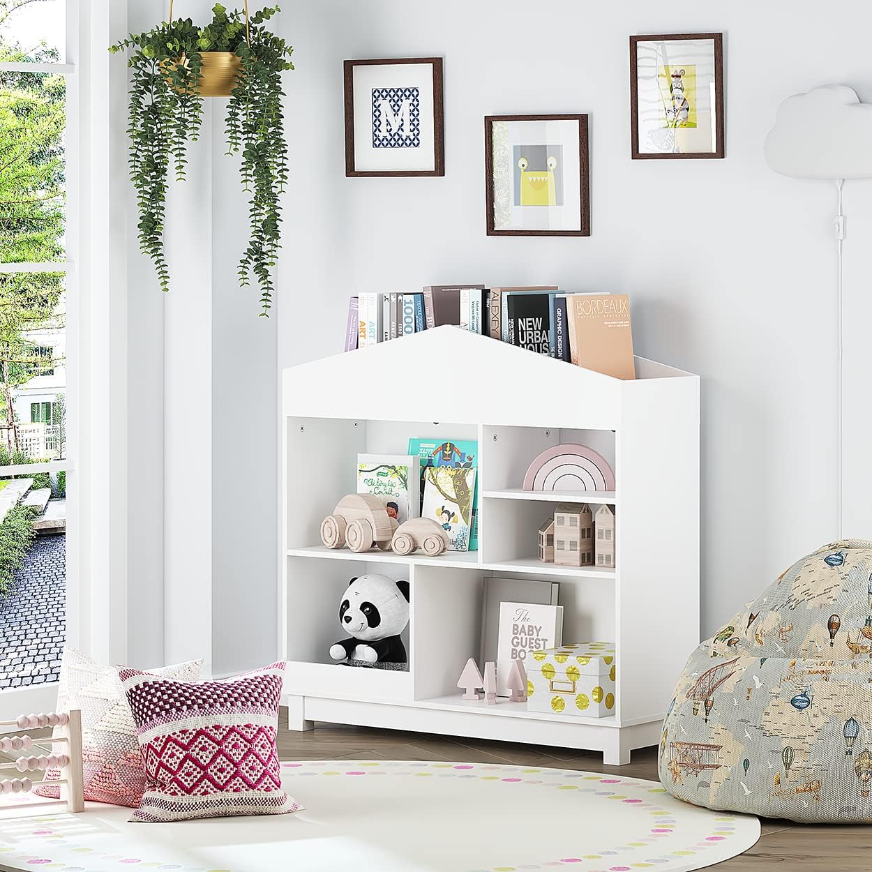 - LARGE STORAGE CAPACITY:This kid’s bookshelf and toy organizer can save a lot of space. The top of the dollhouse-shaped bookshelf can display and place commonly used books and toys; the middle storage cabinet of the bookshelf can display and place children's books, magazines, toys, balls, blocks and other children's toys.