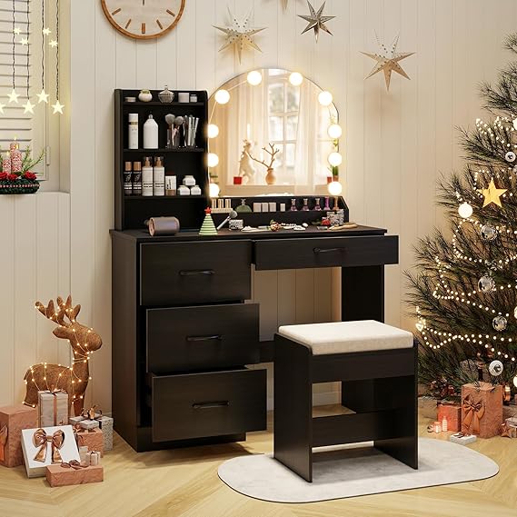 Transform your bedroom with this modern vanity desk set featuring an illuminated mirror with 3-color lighting modes and adjustable brightness. This elegant dressing table combines functionality with style, offering ample storage and organization solutions for your beauty essentials.