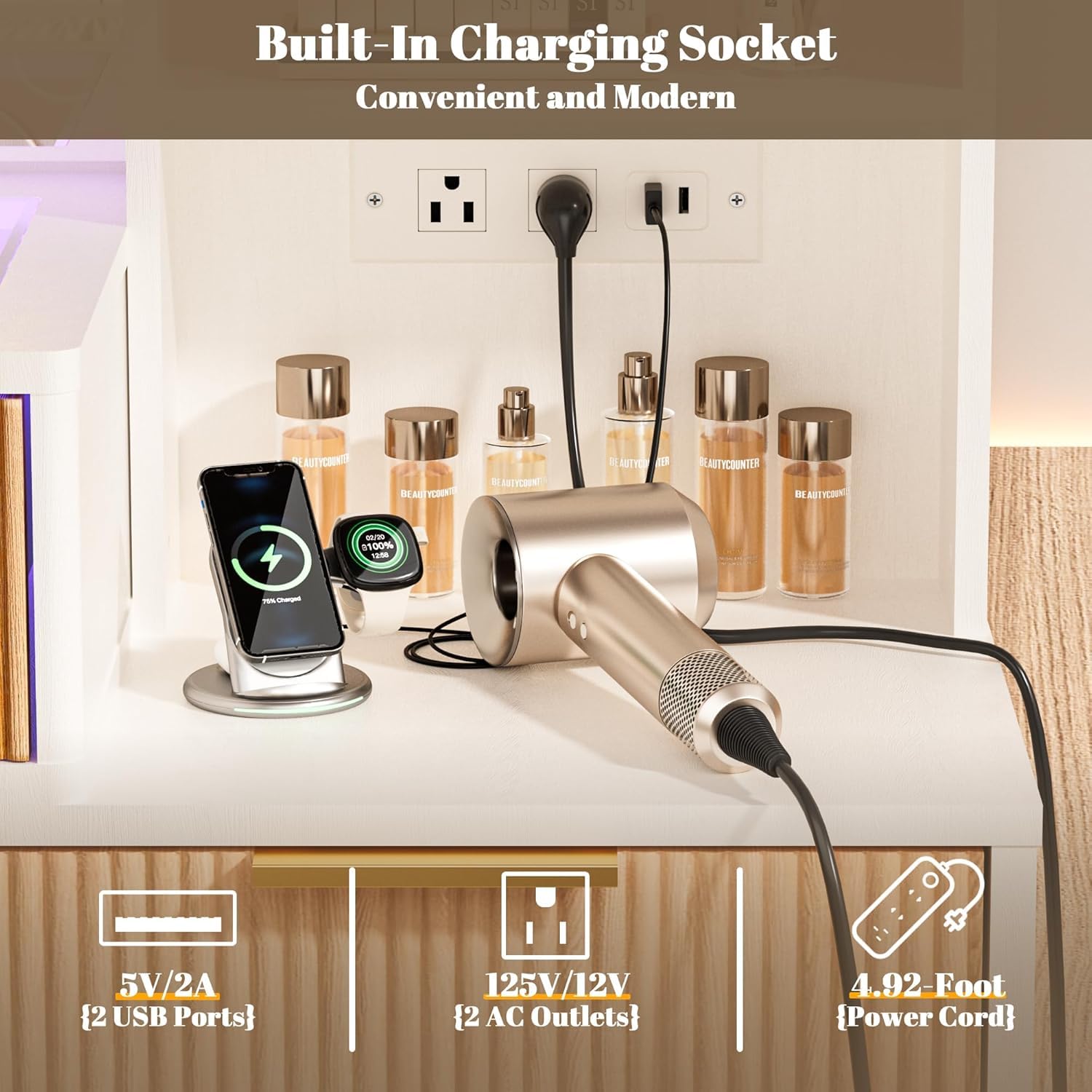 This vanity desk streamlines your beauty routine with thoughtful features designed for modern living. The adjustable lighting ensures flawless makeup application in any setting, while the built-in power outlet keeps your styling tools within reach. Ample storage keeps your space organized and clutter-free.