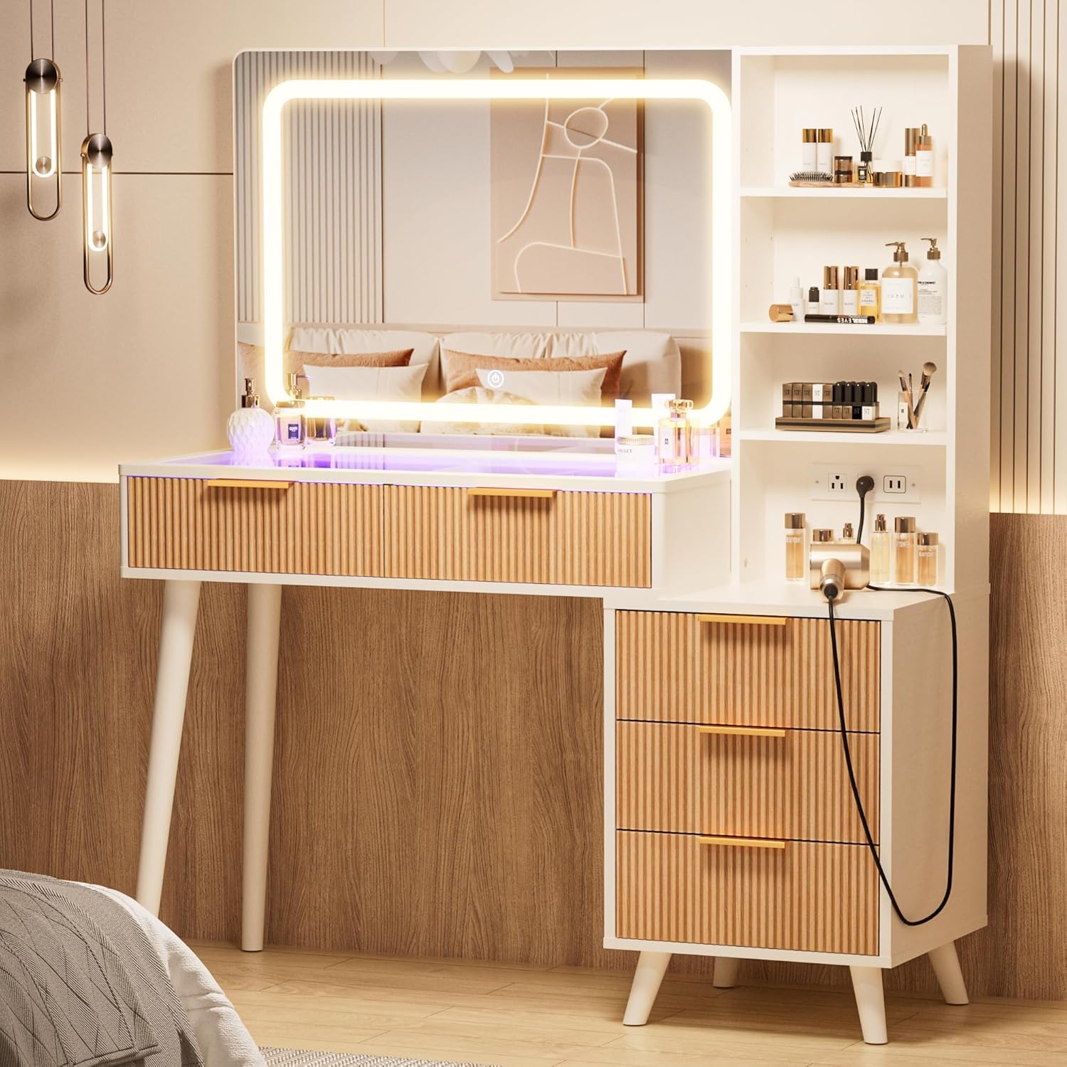 - 5 drawers and open shelves for organized storage of cosmetics and accessories