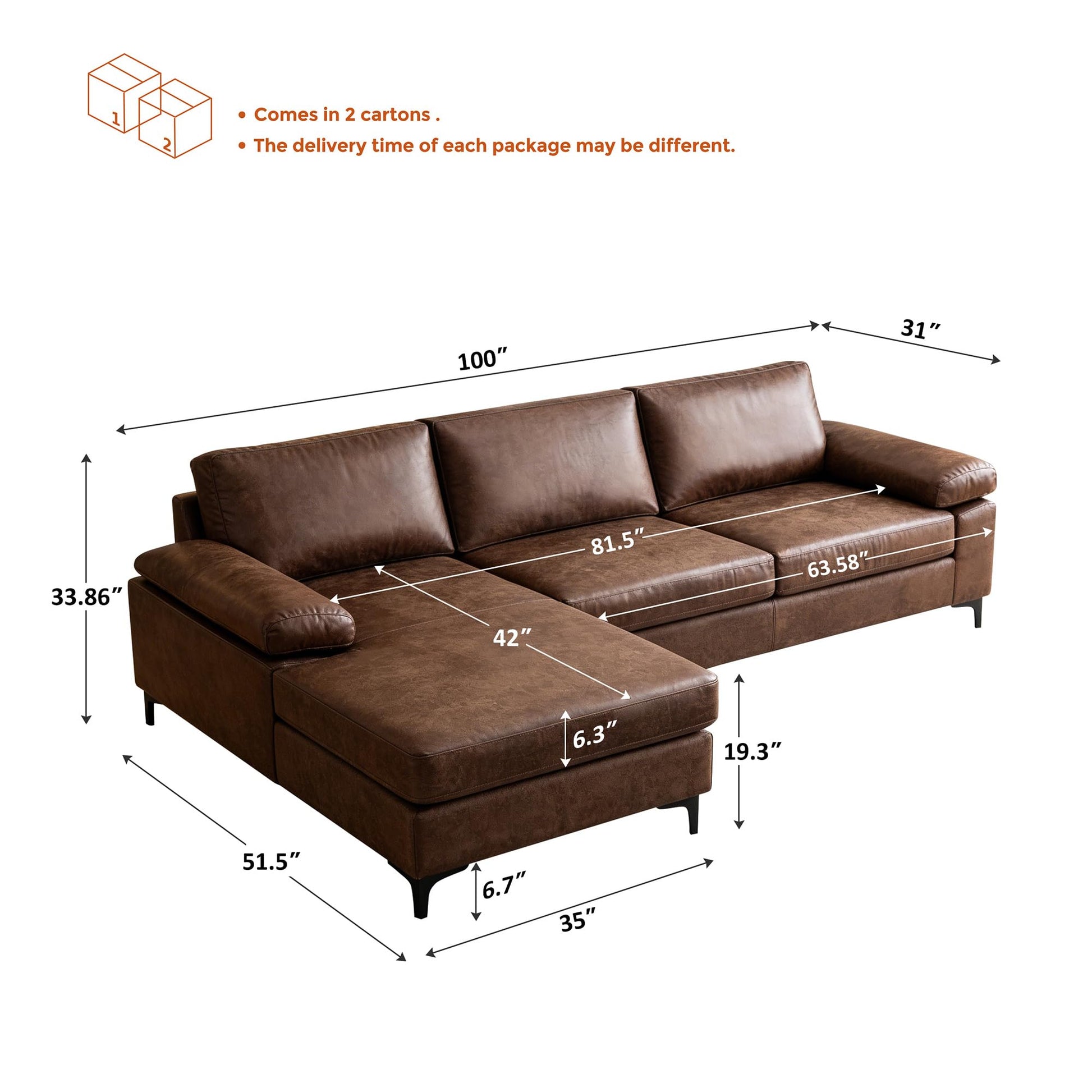 - Faux Leather Sofas with Chaise Size: The modular faux leather couch, measuring 100" W x 51.5" L x 33.86" H, is large enough for you to fully relax while taking a nap. Its moderate size also makes it suitable for a variety of places, such as offices, living rooms, and apartments.
